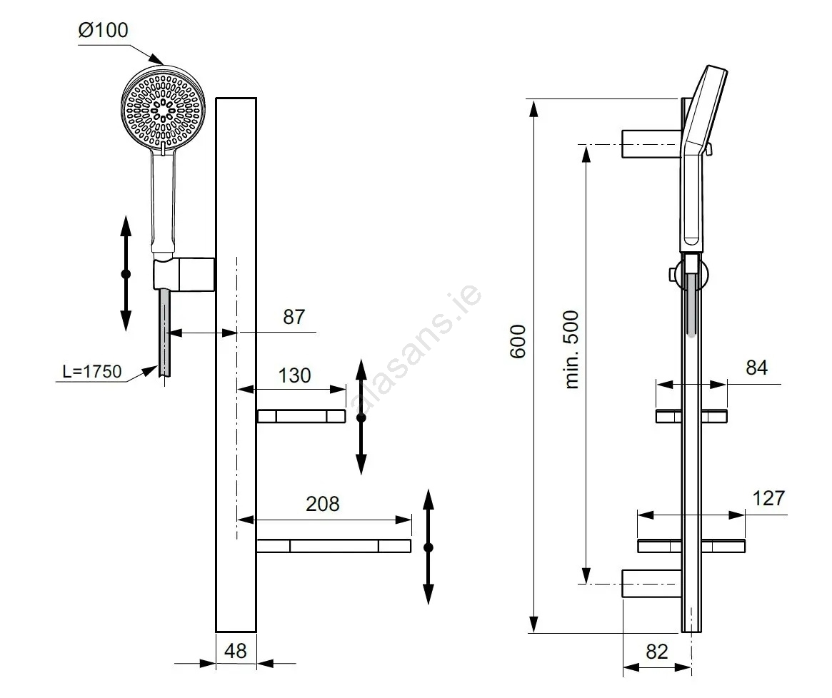 • The shower rail has an overall length of 600 mm and a minimum mounting distance of 500 mm.