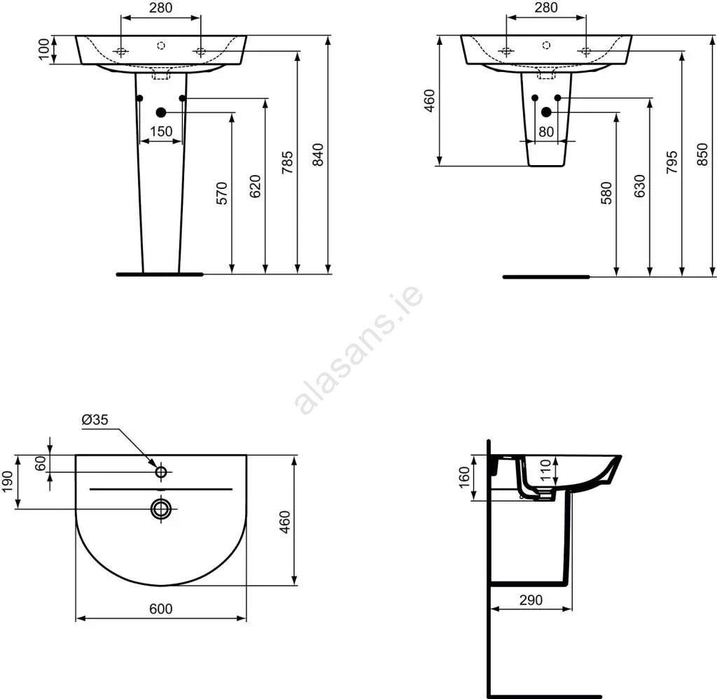 • The basin is available in standard white.