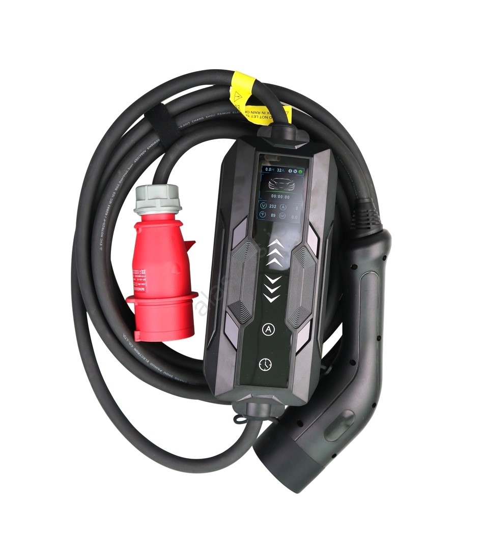 • This charging station is equipped with a cable featuring a CEE connector on one end and a Type-2 plug on the other, ensuring compatibility with a wide range of electric cars and plug-in hybrids.