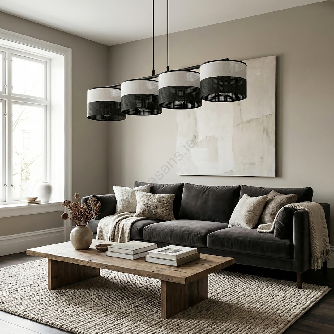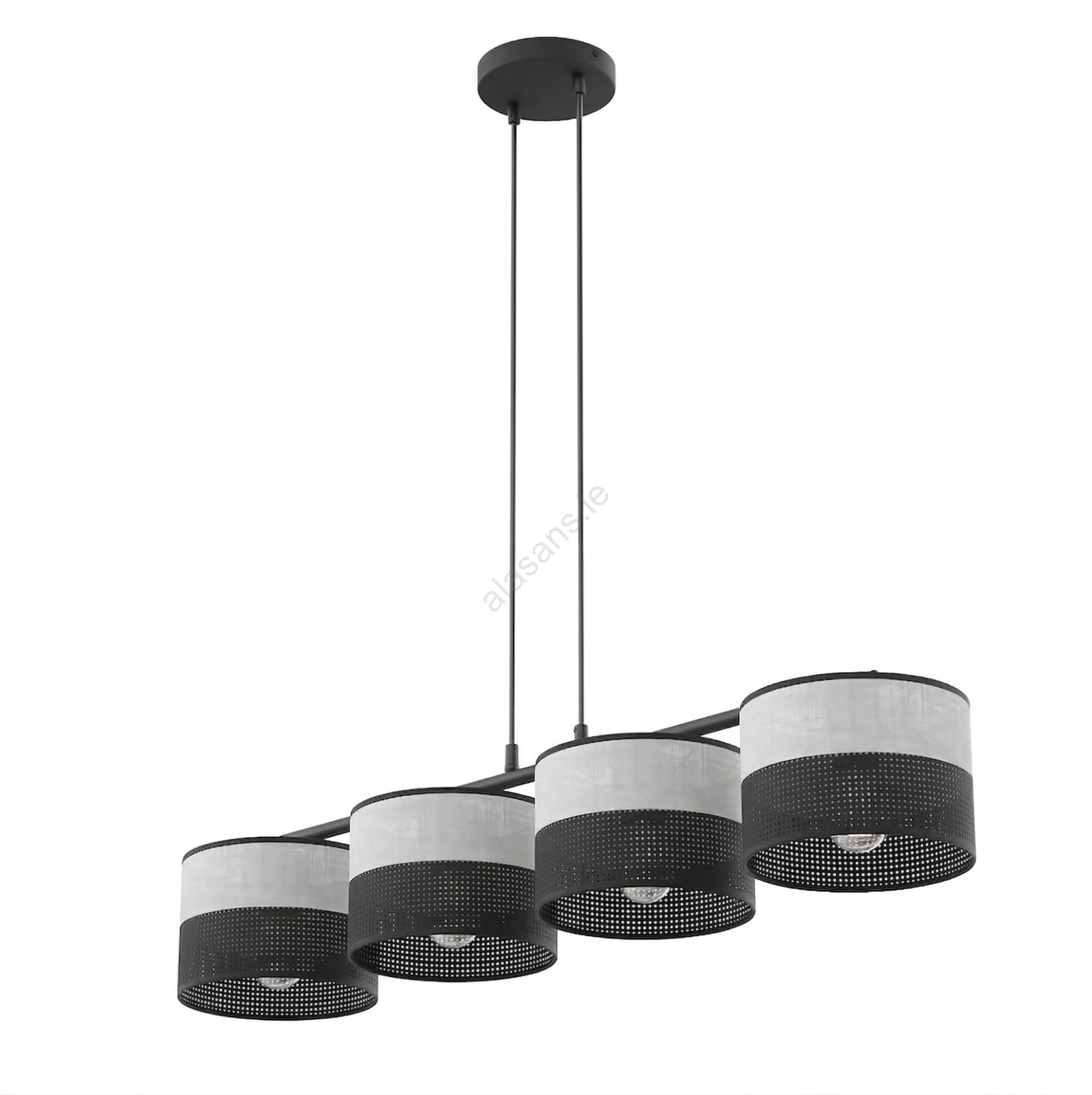 KARBON cable-hung chandelier 4xE27/15W/230V black/grey characterizes nice and functional design.  A bulb with E27 cap is suitable for the light. Here, you can buy other bulbs at advantageous prices. You will have an interesting addtiion to your home.