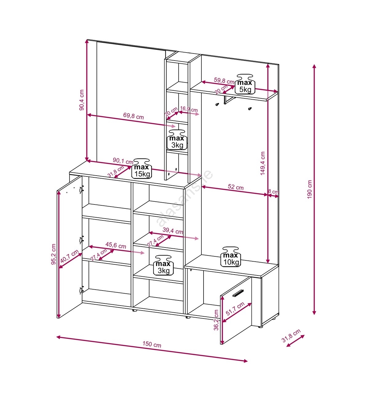 • Beneath it are several closed compartments and open shelves for shoes, accessories or other everyday necessities.