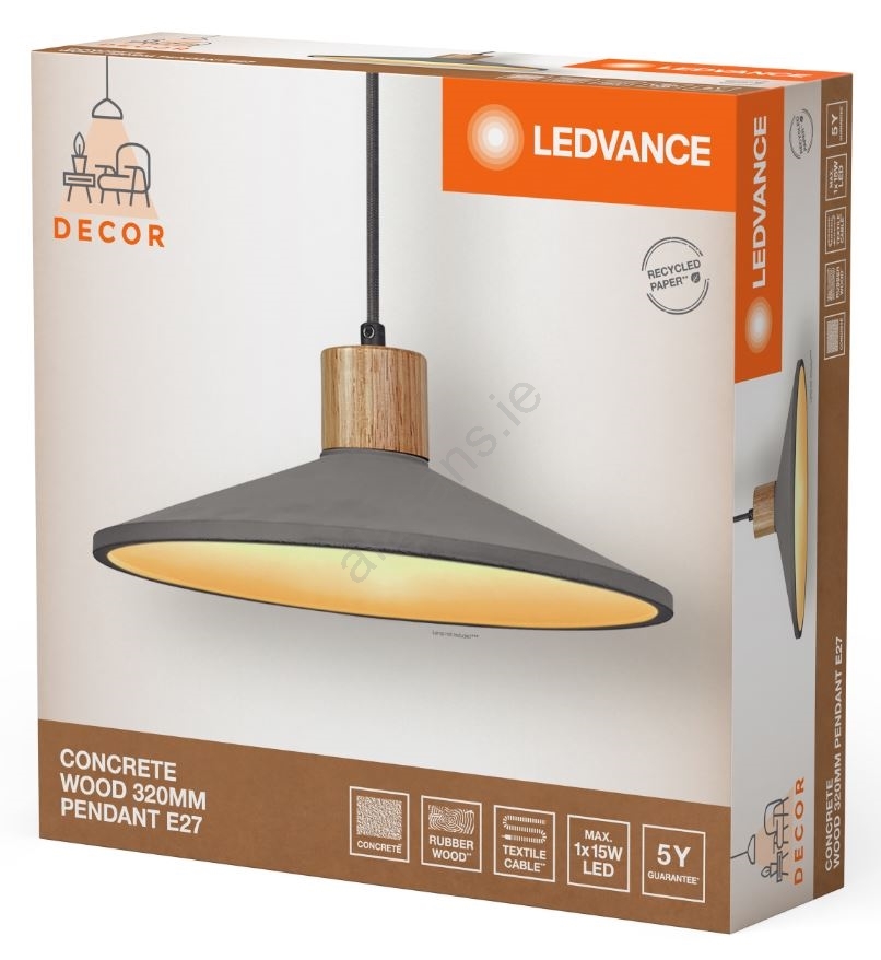 Ledvance - Chandelier on a string DECOR CONCRETE 1xE27/15W/230V d. 32 cm concrete grey characterizes nice and functional design.  A bulb with E27 cap is suitable for the light. Here, you can buy other bulbs at advantageous prices. You will have an interesting addtiion to your home.