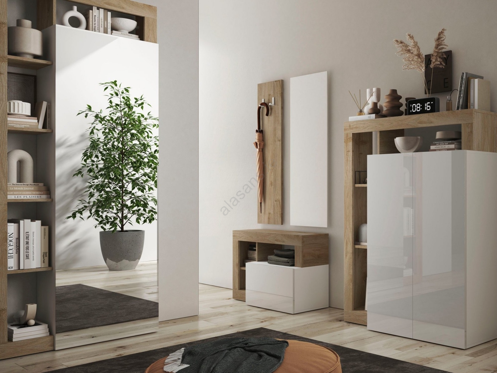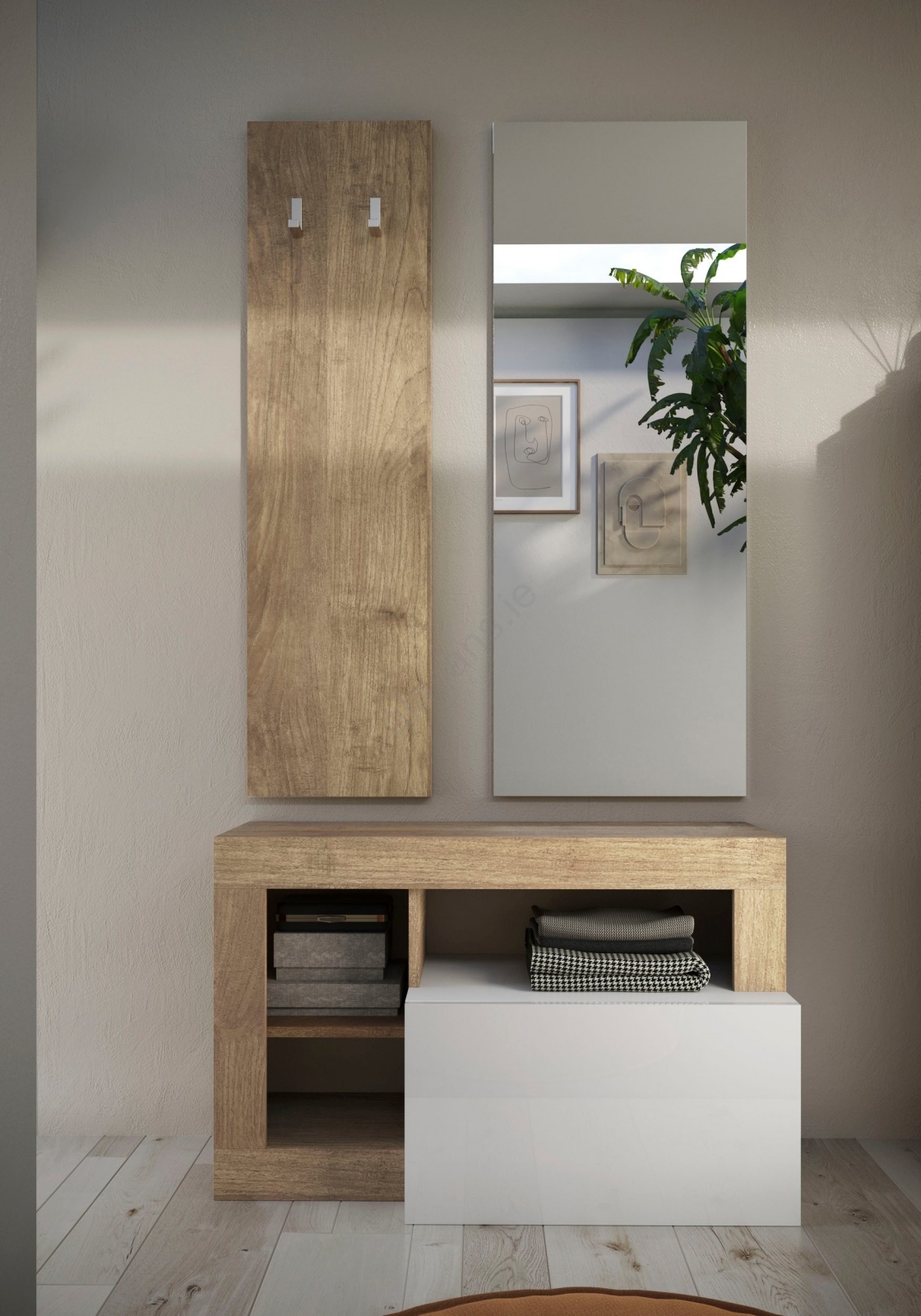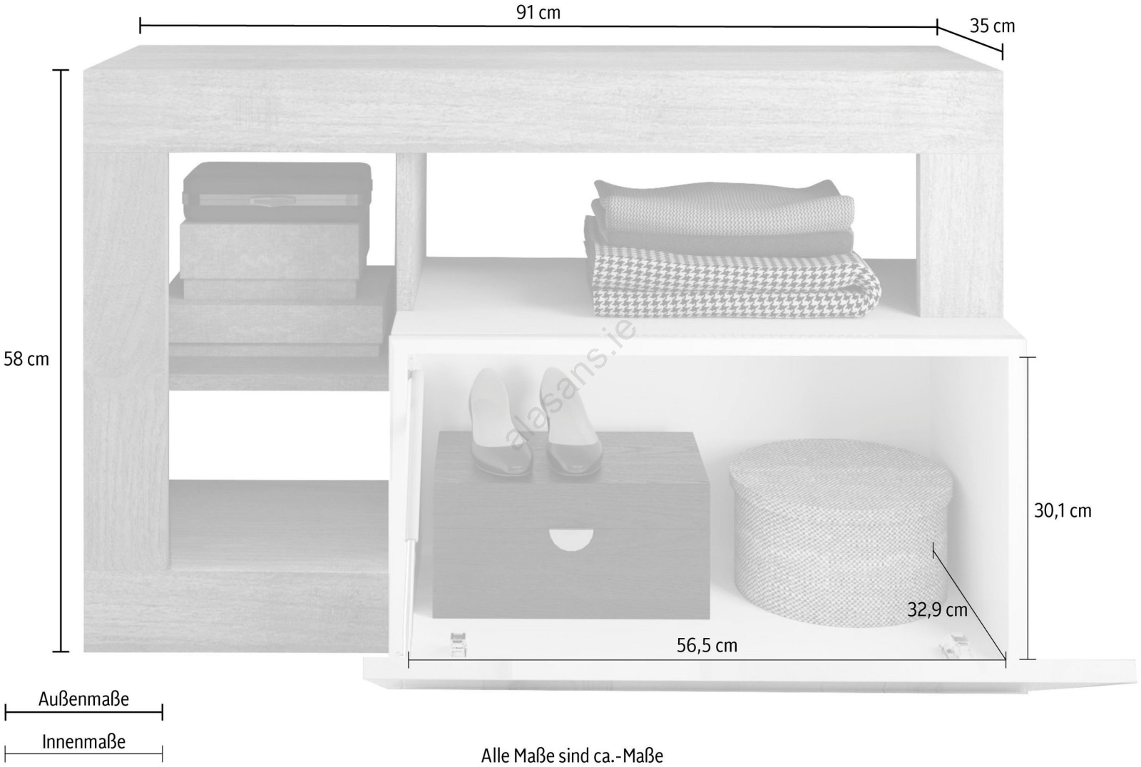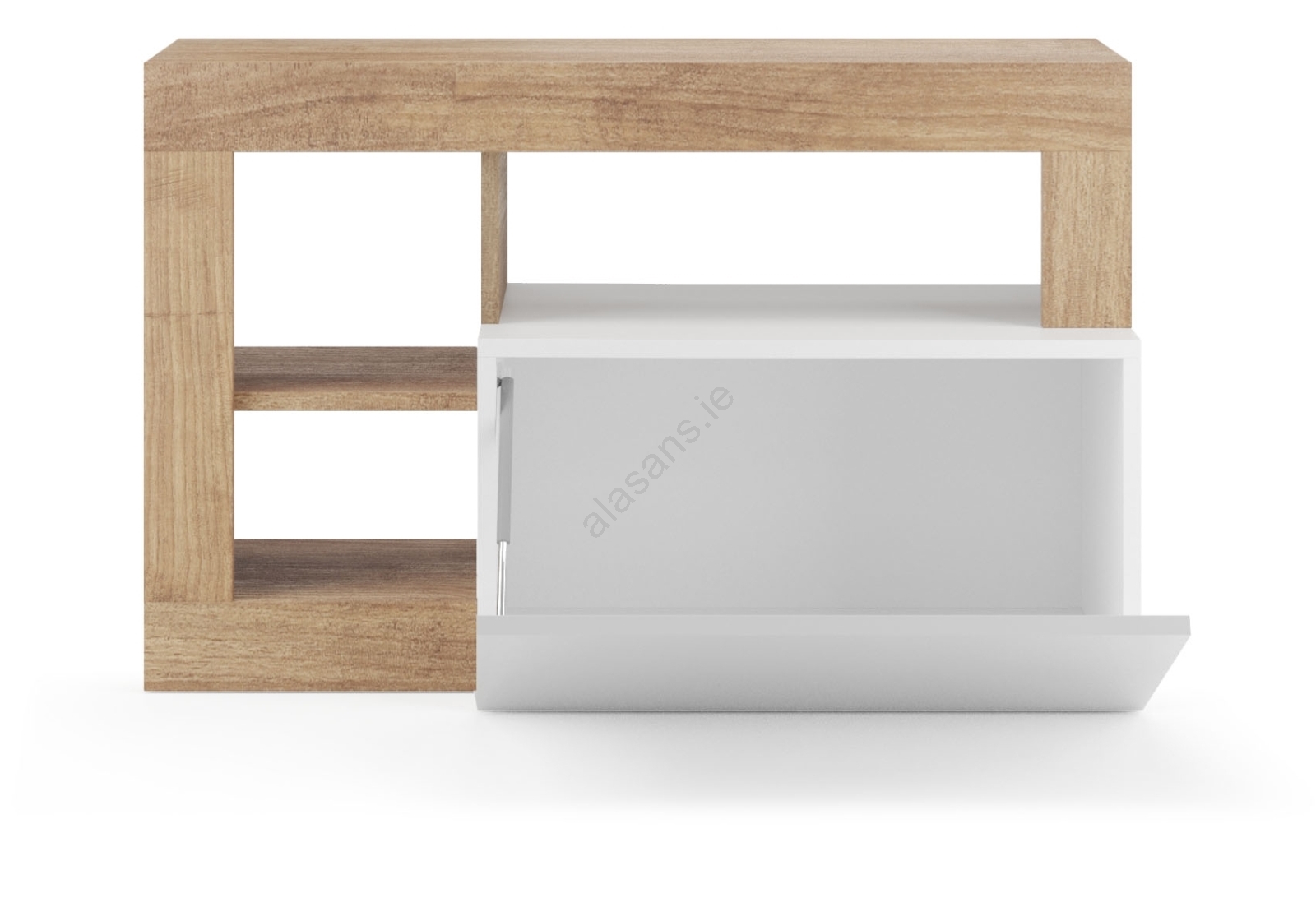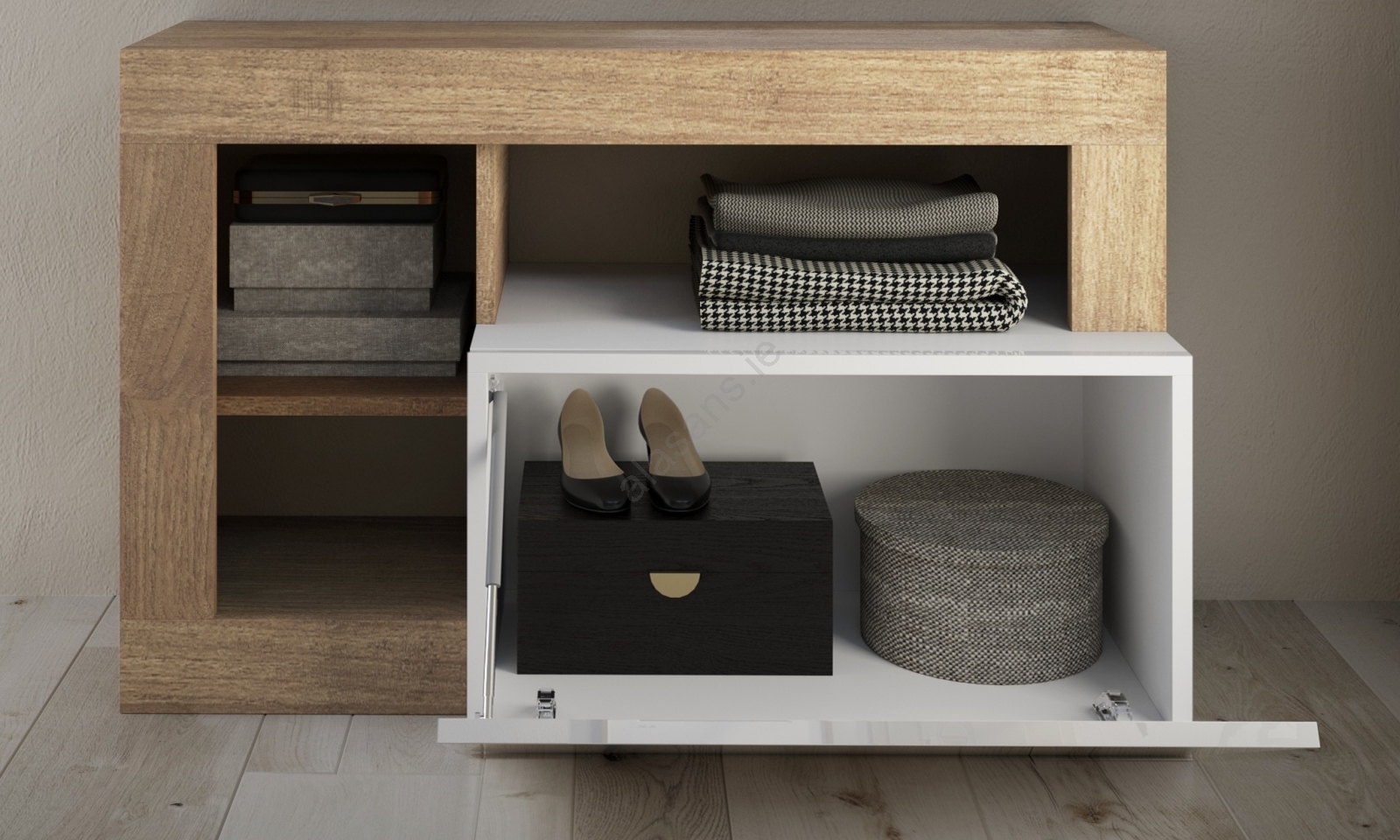 • Features 3 open shelves and an internal shelf with a flip-up front for storing bags, shoes and seasonal items.