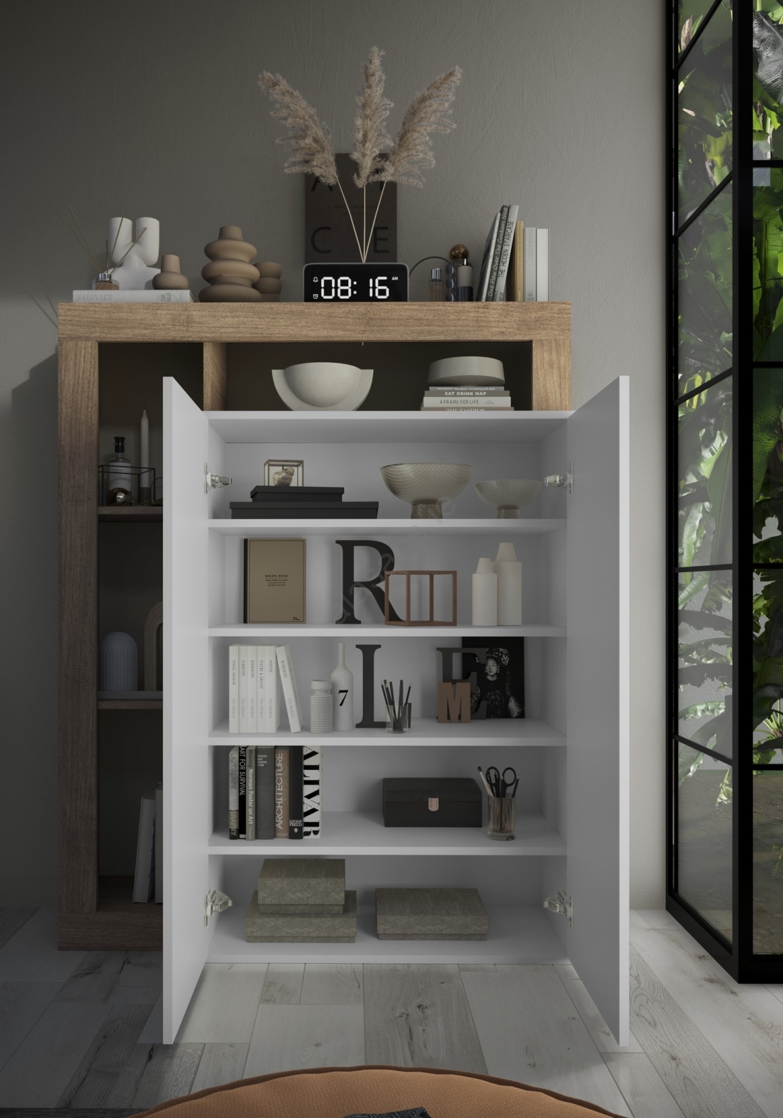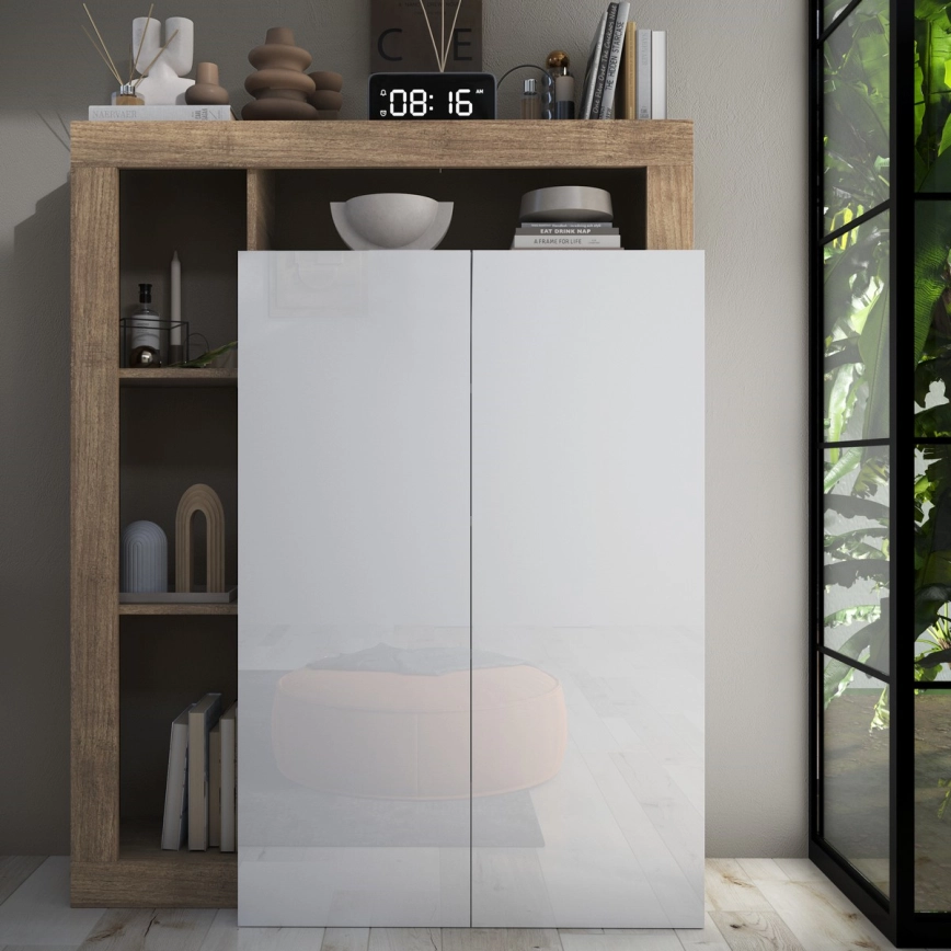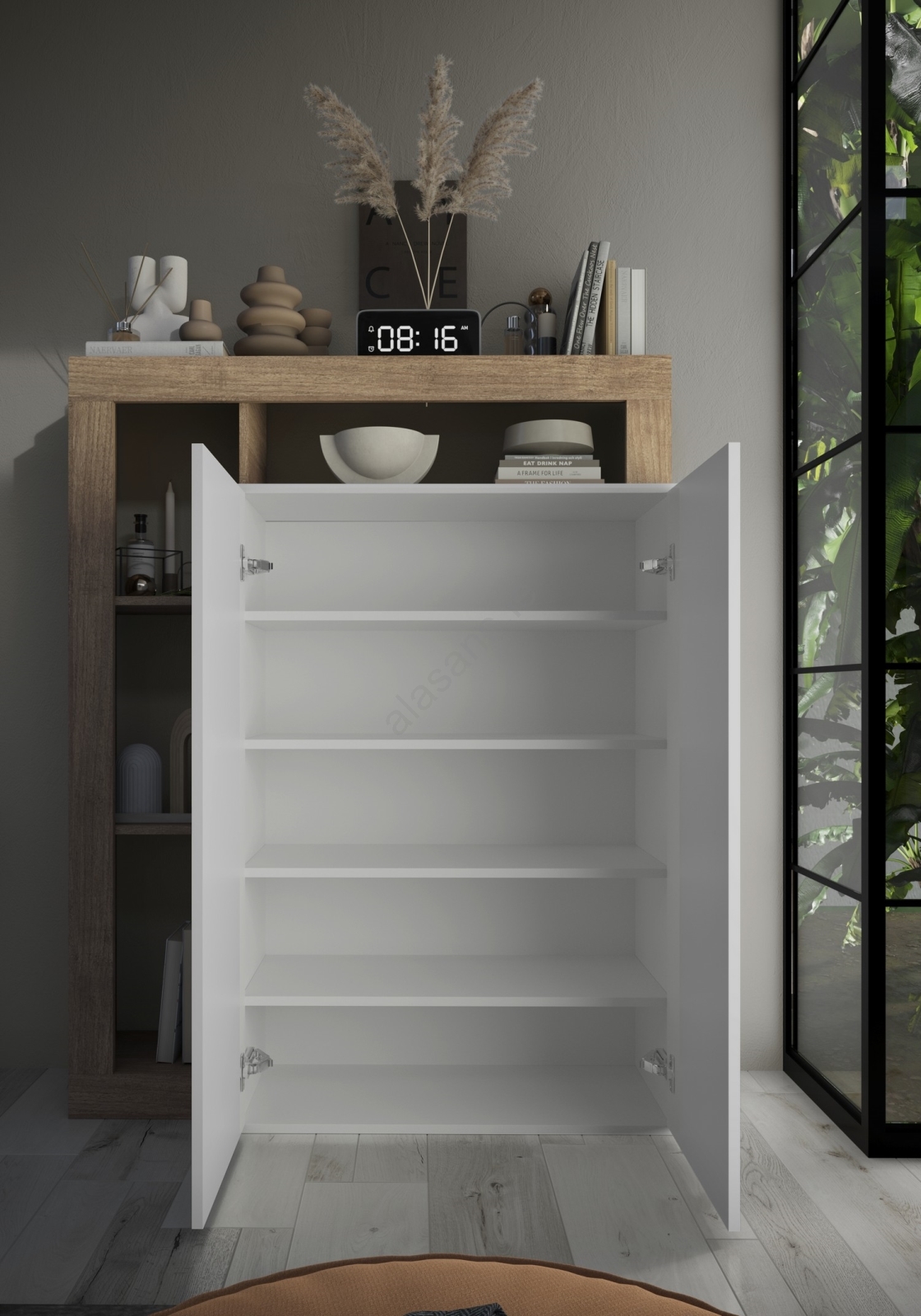 • Features 4 open shelves and 5 internal compartments for storing bags, shoes and seasonal items.