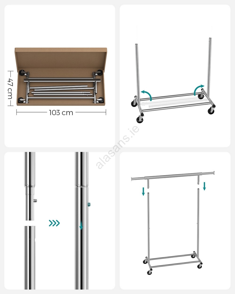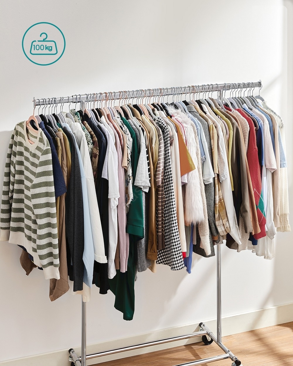 • The top bar supports up to 90 kg (when evenly distributed) without wobbling or tipping; the extendable rod provides extra space for your clothes, hats, bags, etc.