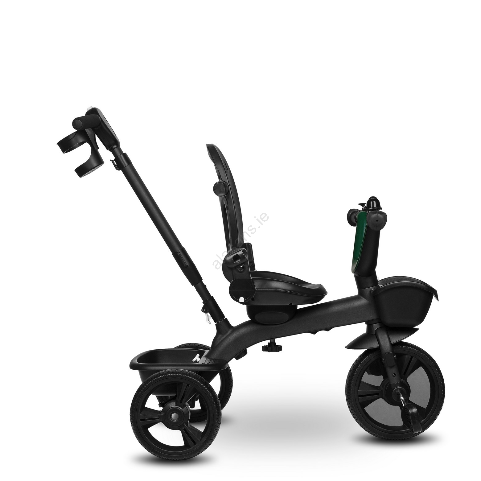 • Includes a 3-point harness, padded seat and backrest, bell, front mudguard, drink holder, storage basket and a canopy with reflective trim for visibility at dusk.
