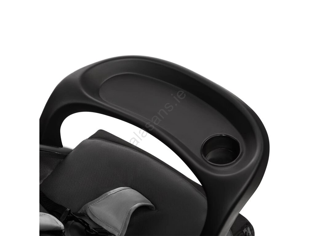 • The stroller includes a tray-style guard that lets the child set down a bottle or snack during a walk.