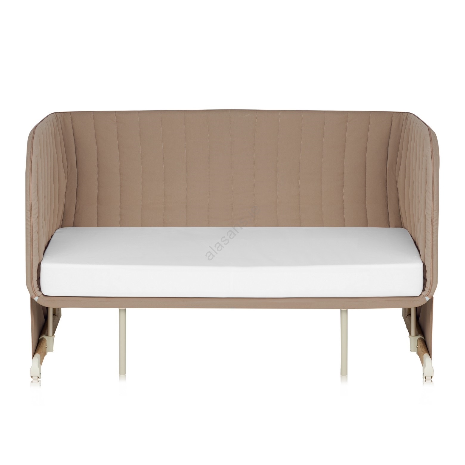 • Bedside sleeper with a removable side panel and adjustable legs to match parents' bed height.