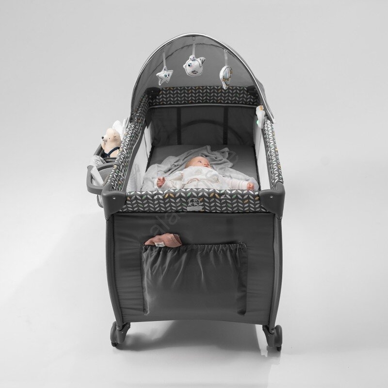 • Included in the package: changing table with side pockets (for diapers, powder, etc.), an accessory basket with two compartments, a large mosquito net, a canopy and a toy bar with plush toys.