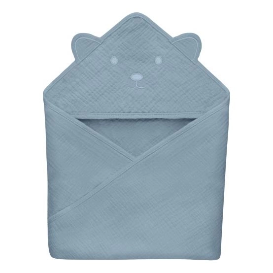 • A hooded towel made from soft cotton muslin provides maximum comfort after every bath.
