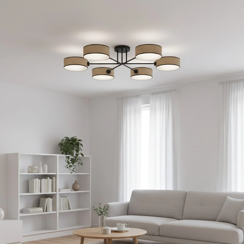 MAGA Flush-mount Chandelier 6xE14/10W/230V, Beige characterizes nice and functional design.  A bulb with E14 cap is suitable for the light. Here, you can buy other bulbs at advantageous prices. You will have an interesting addtiion to your home.