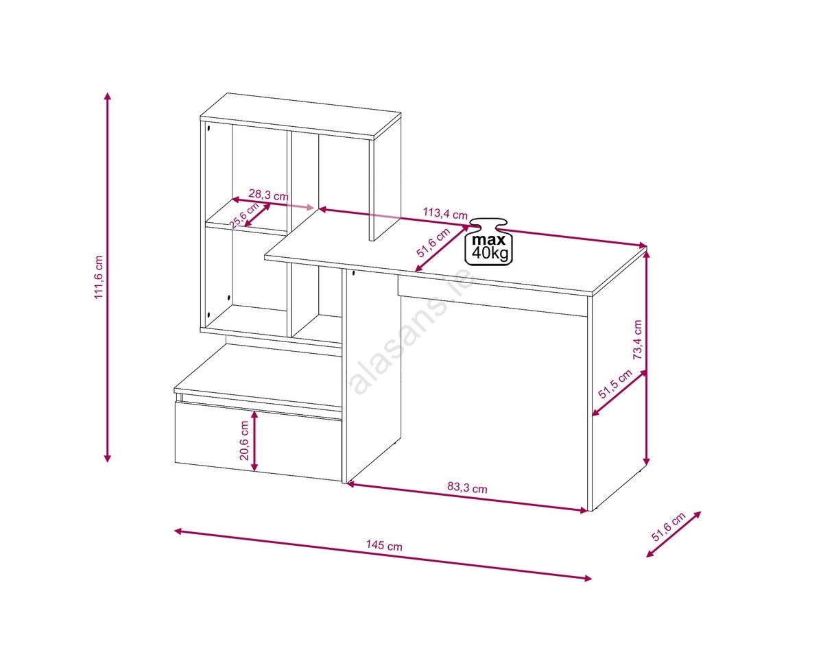 • The rectangular work surface is supported by a side unit with two open shelves, ideal for storing books, office supplies, or decorative items.