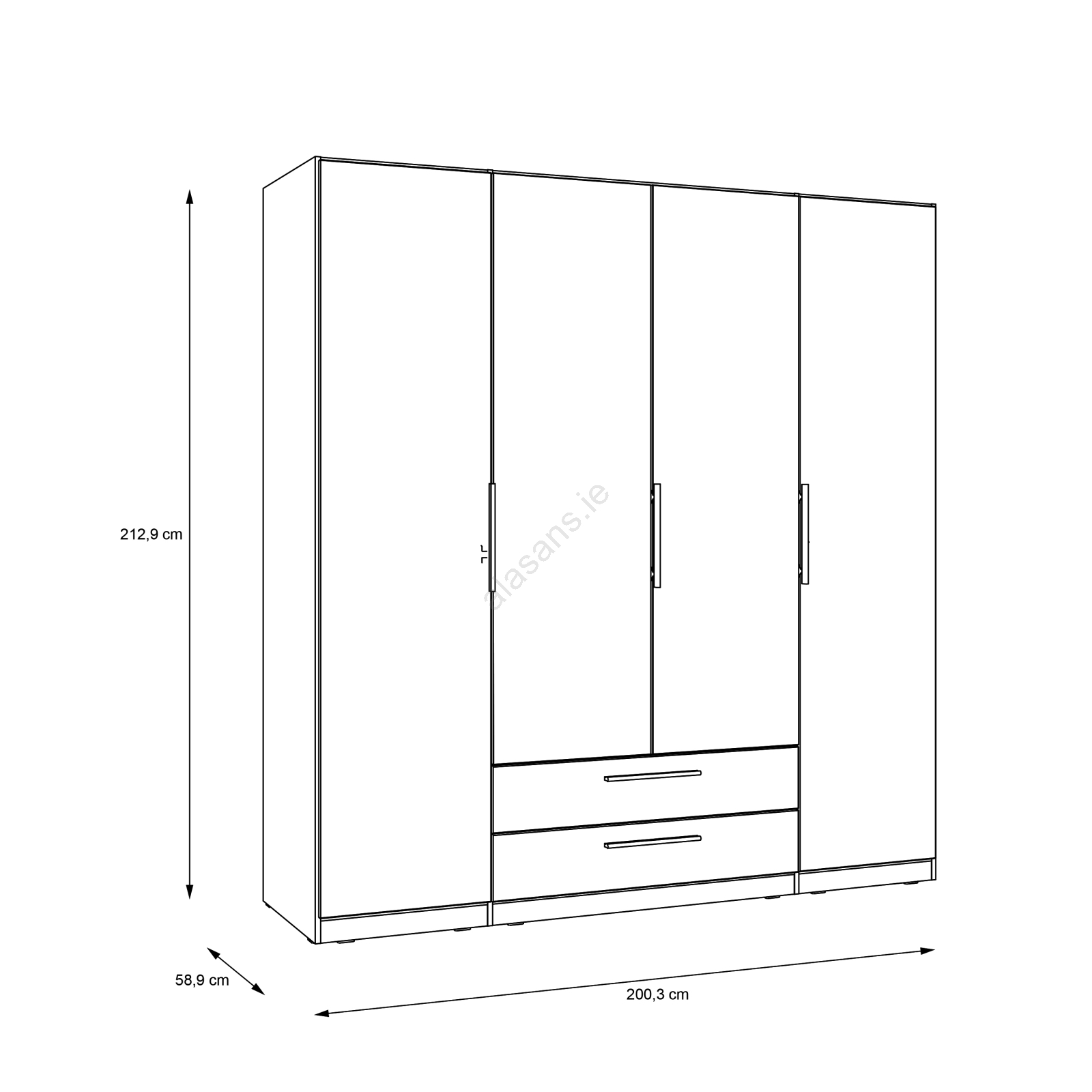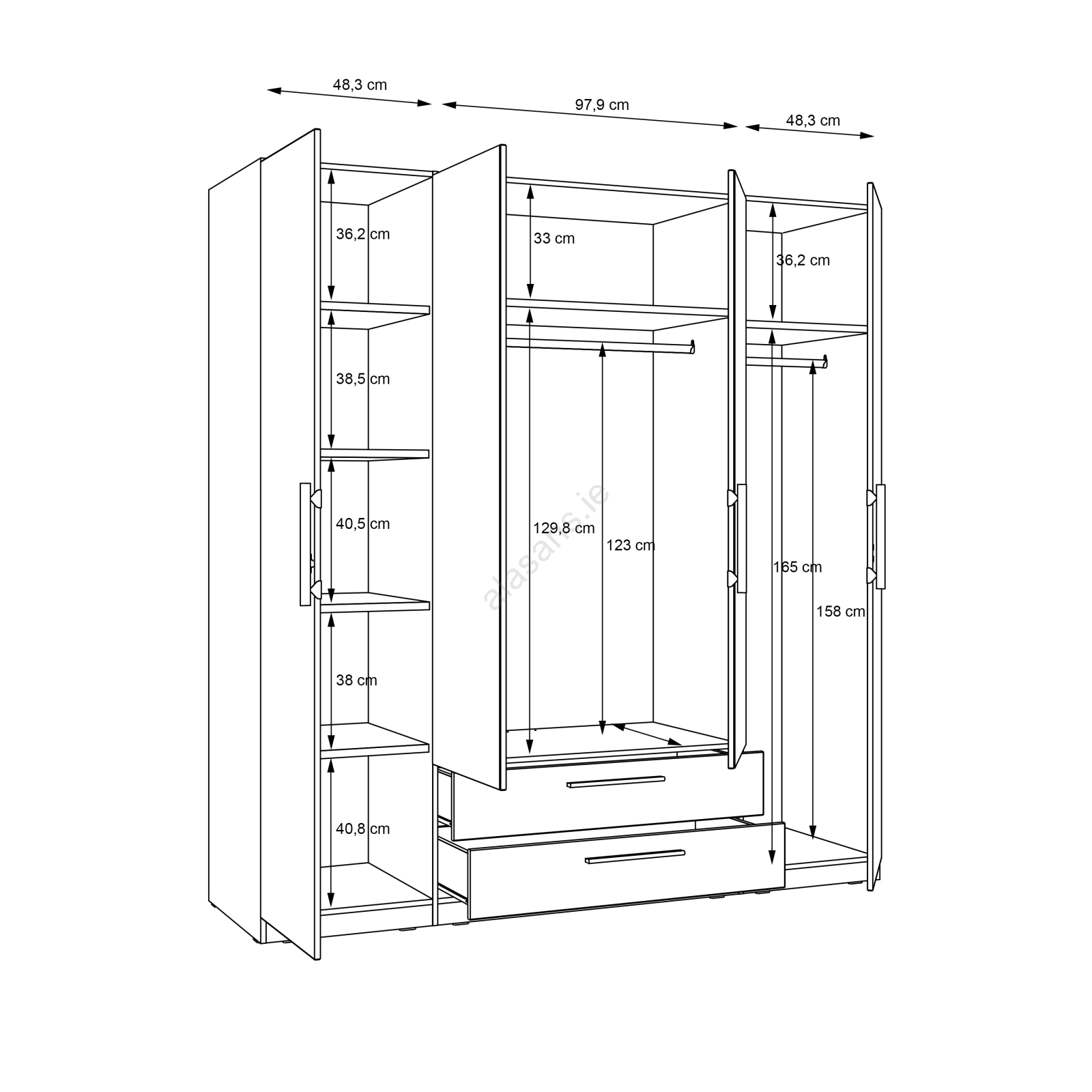 • The wardrobe features hanging rails, drawers, shelves and generous storage space for your clothes, bags and seasonal items.