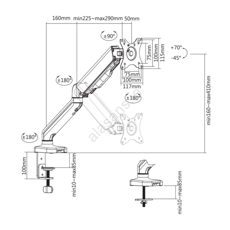 • Once attached to the desk, the mount allows side-to-side swivel, horizontal and vertical rotation, tilting at various angles, and height adjustment.