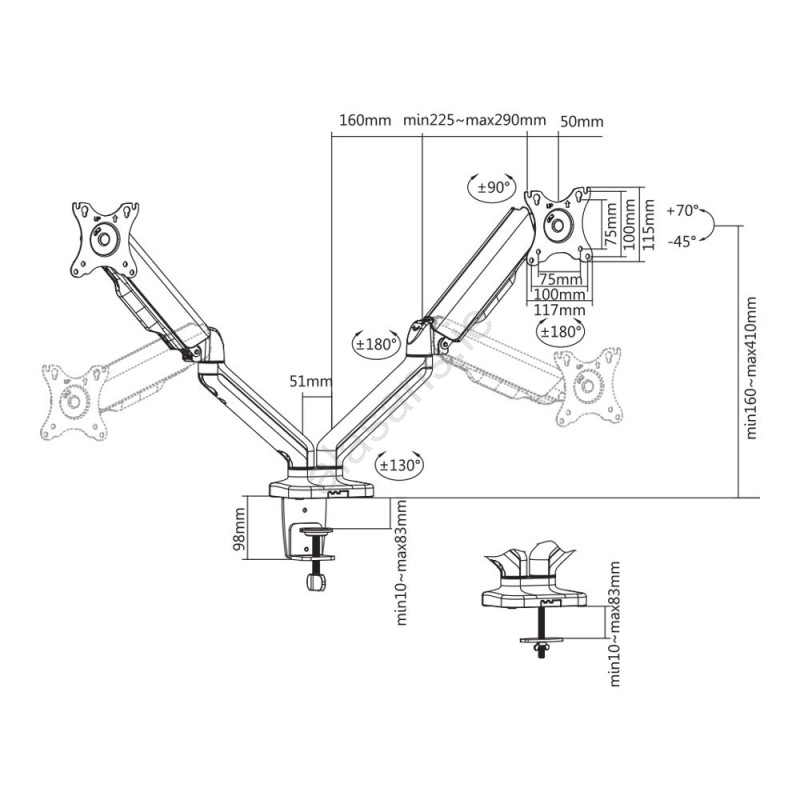 • It offers 2 methods of desk attachment: clamp mounting on the desk edge (worktop thickness 10 - 83 mm) or through-desk fixing anywhere on the desk surface.