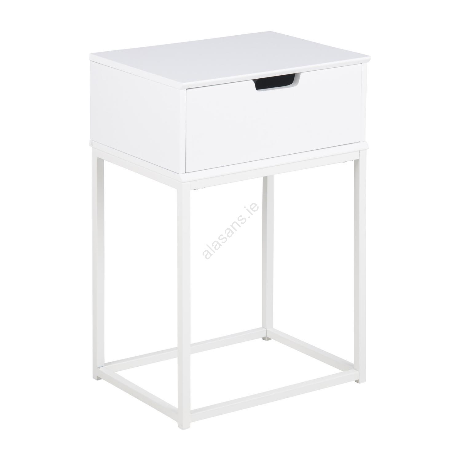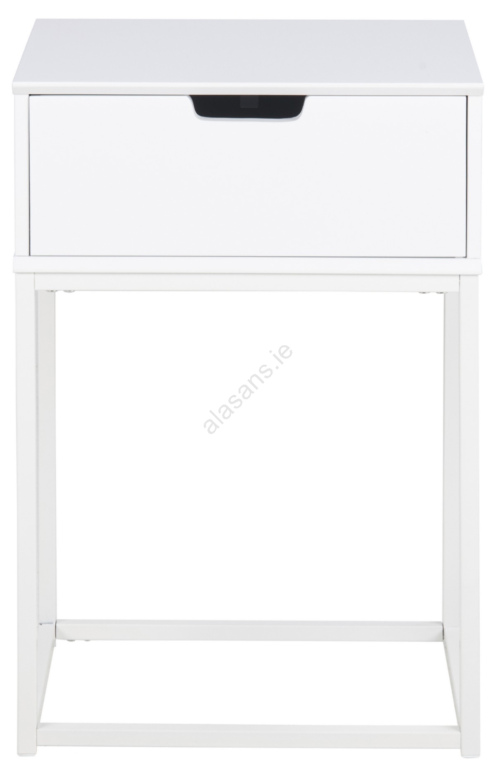 • Top, frame and drawer crafted from MDF with a white UV-cured lacquer; base in steel with a white powder-coated finish.