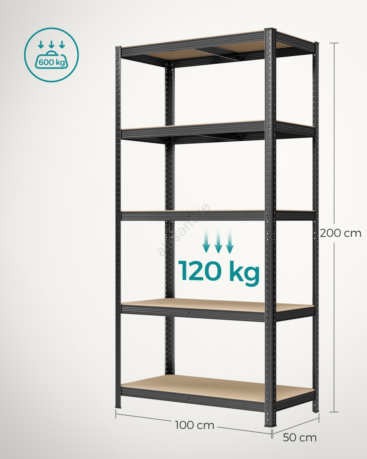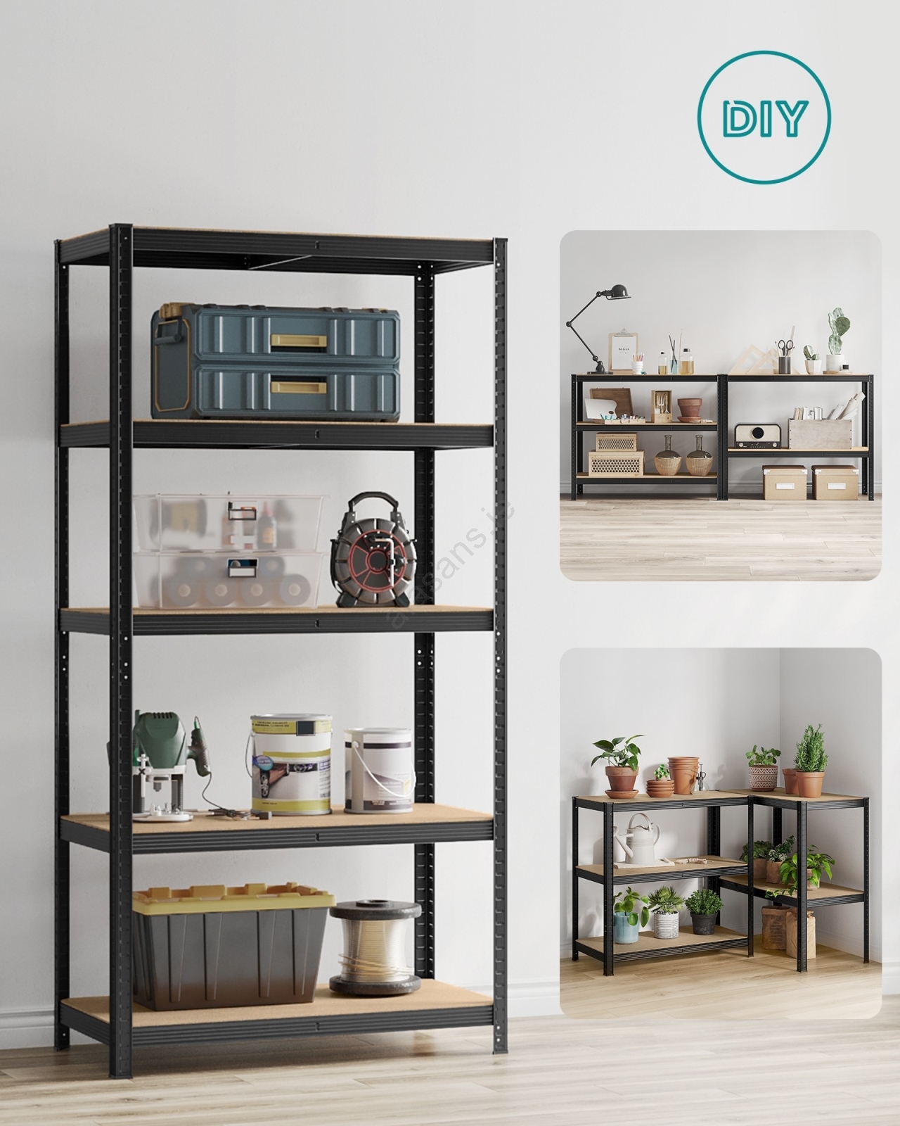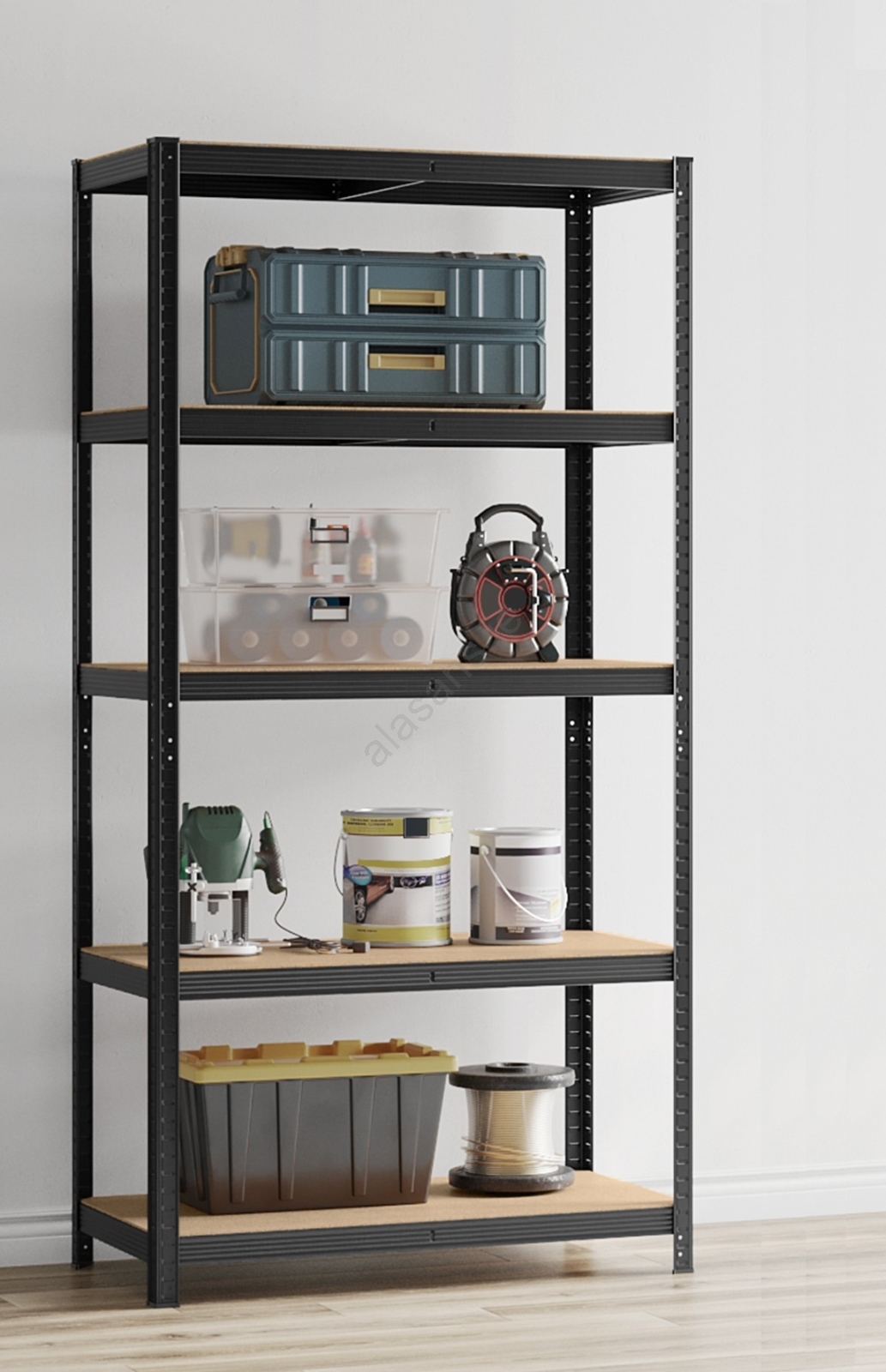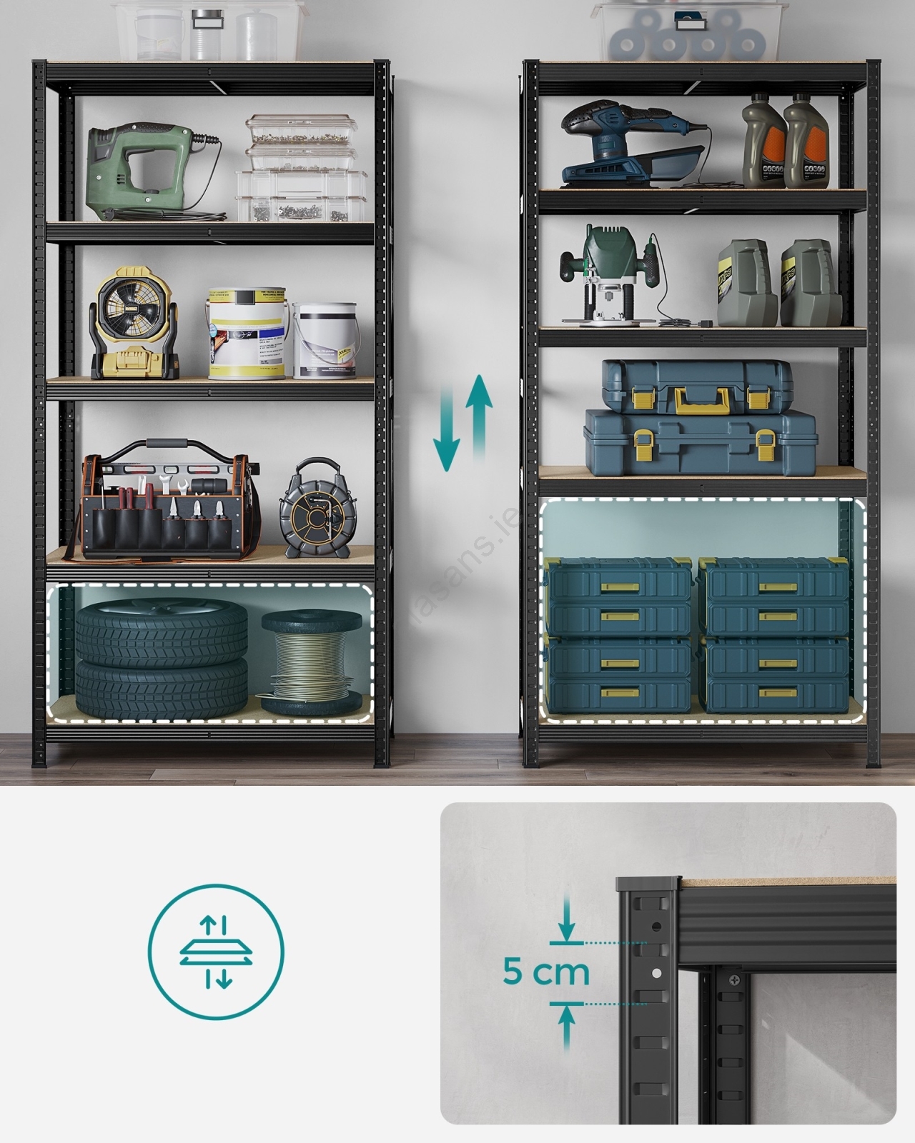 • Each shelf supports up to 120 kg, safely accommodating paint cans, tools and fitness equipment.