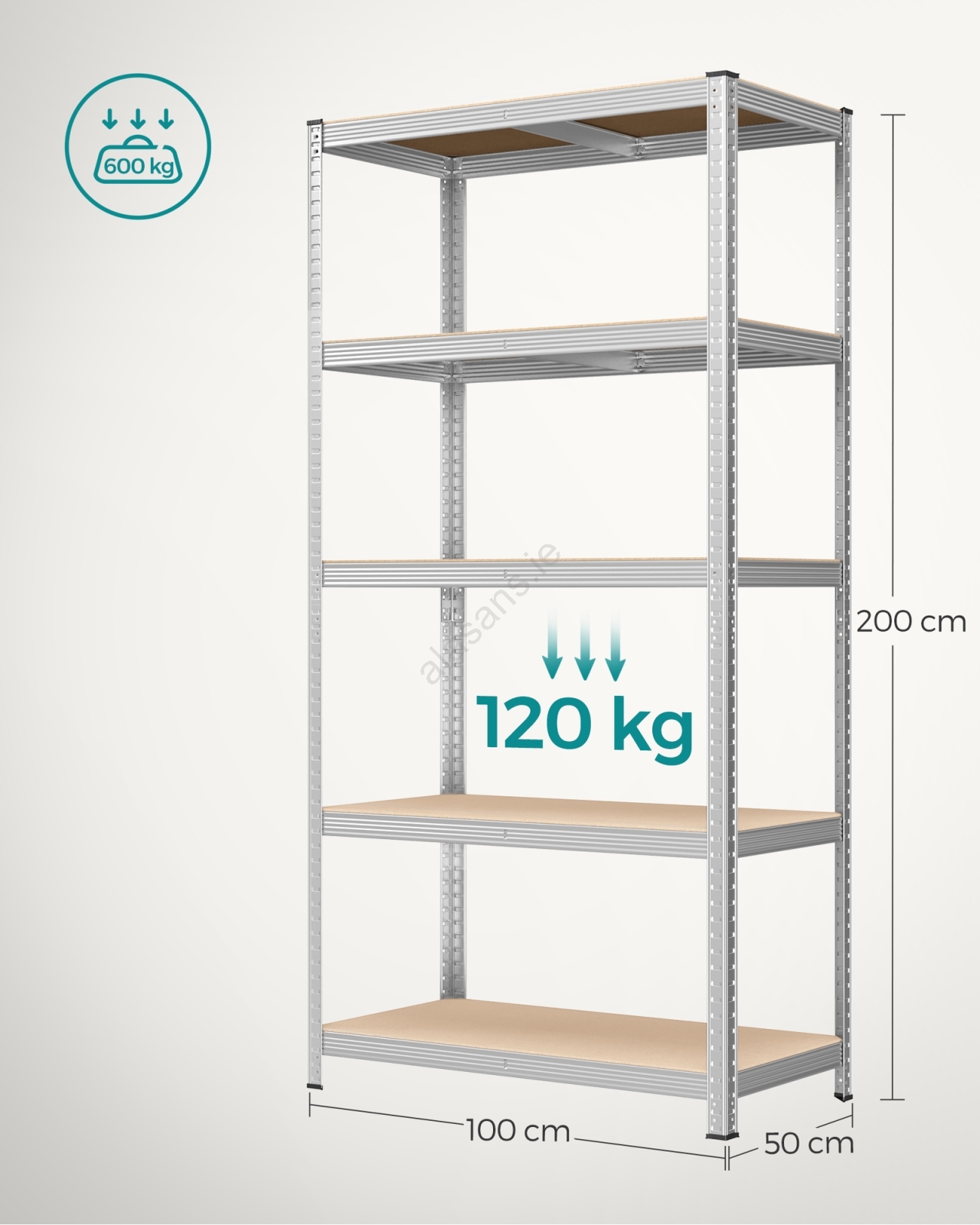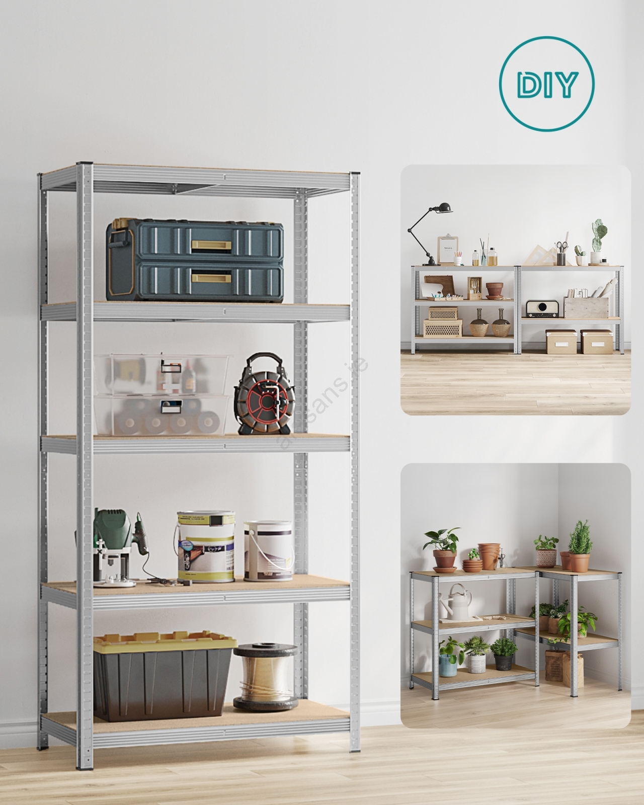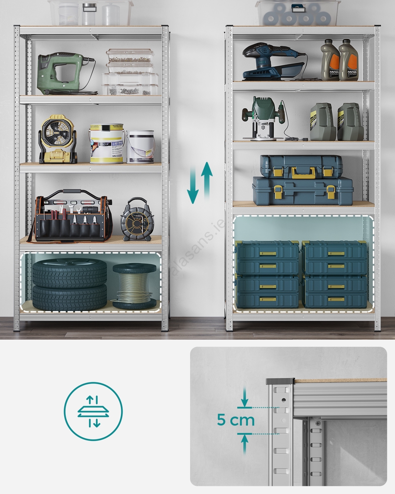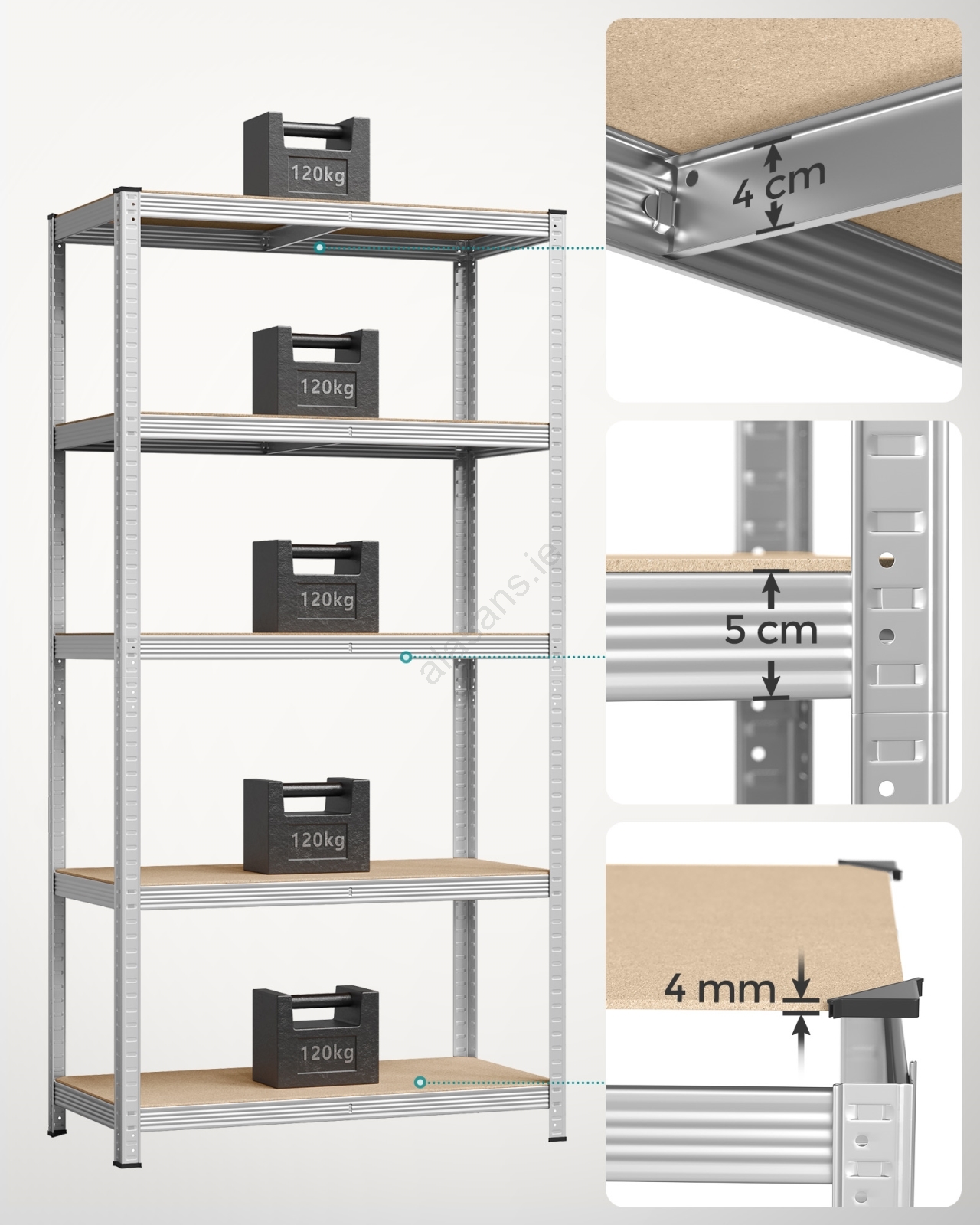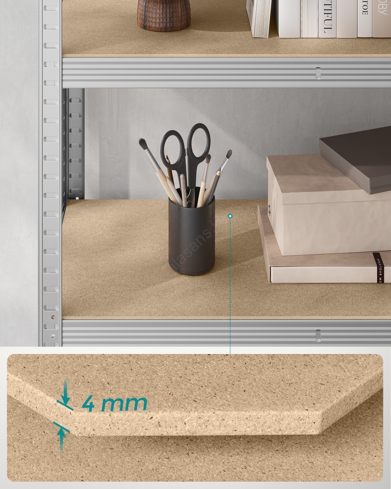 • Each shelf supports up to 120 kg, securely accommodating paint cans, tools and fitness equipment.
