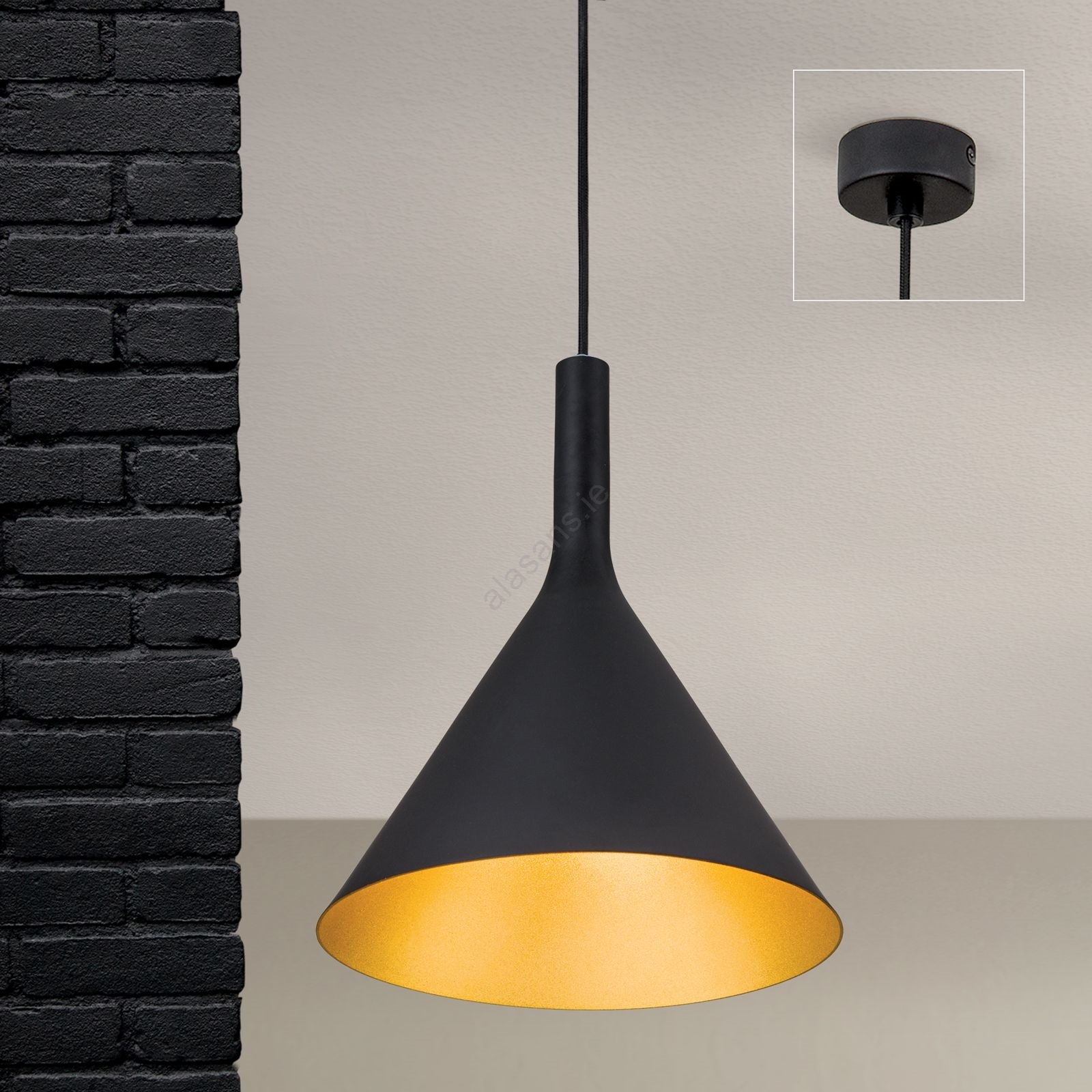 Pendant light on cable GUNDA 1xE27/60W/230V Ø 25 cm black/gold characterizes nice and functional design.  A bulb with E27 cap is suitable for the light. Here, you can buy other bulbs at advantageous prices. You will have an interesting addtiion to your home.