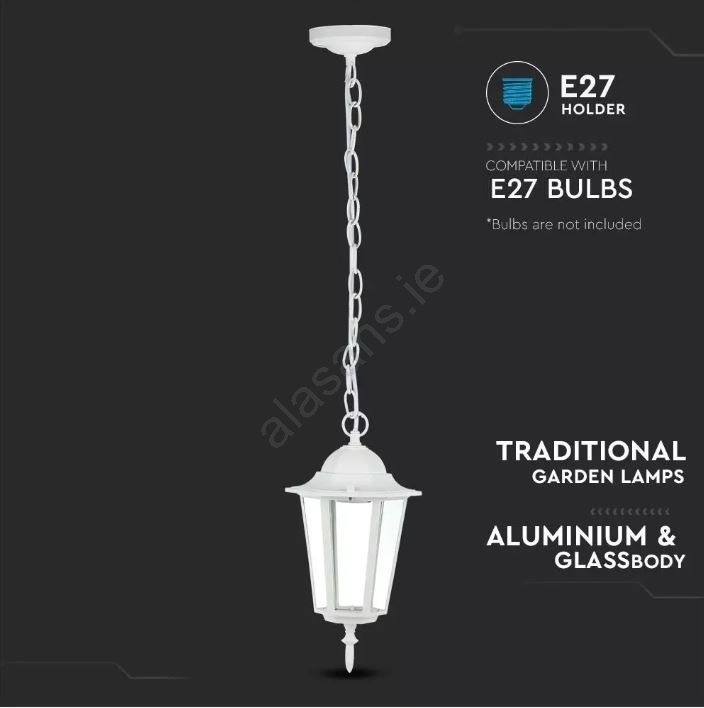 Outdoor chandelier on a chain 1xE27/60W/230V IP44 white characterizes nice and functional design.  A bulb with E27 cap is suitable for the light. Here, you can buy other bulbs at advantageous prices. You will have an interesting addtiion to your home.