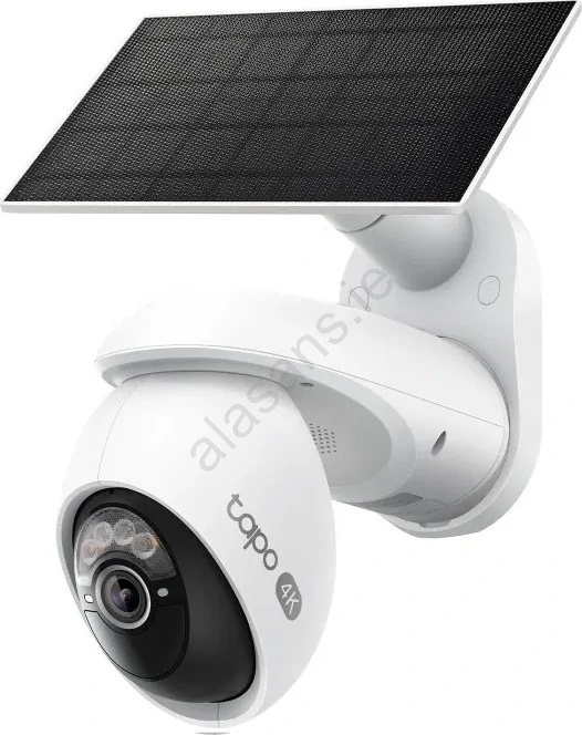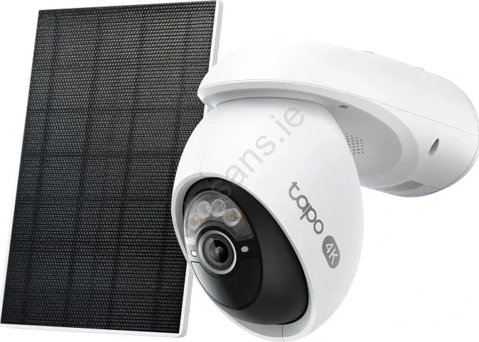 • An outdoor security IP camera with a pan/tilt head and an integrated solar panel for continuous, cable-free power.