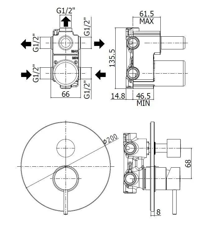 • Designed for three outlets with a combined central diverter position.