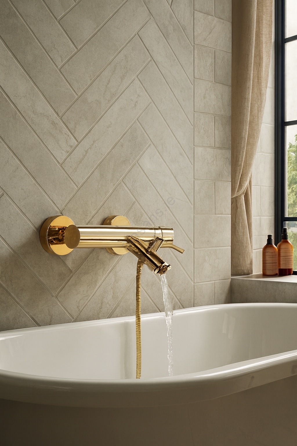 • Wall-mounted bathtub single-lever mixer in an elegant gold finish.
