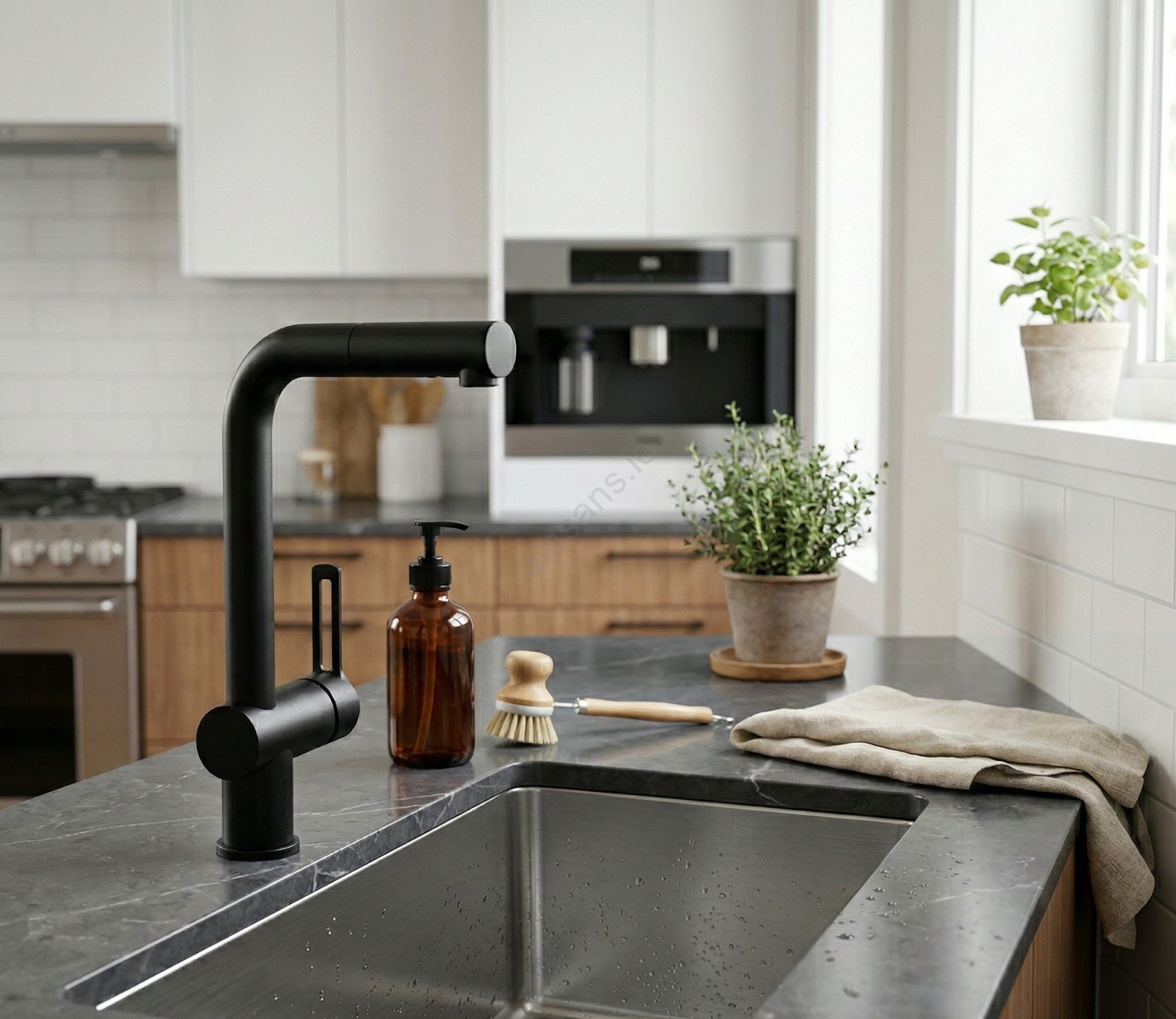 • Modern kitchen sink faucet in an elegant matte black finish.