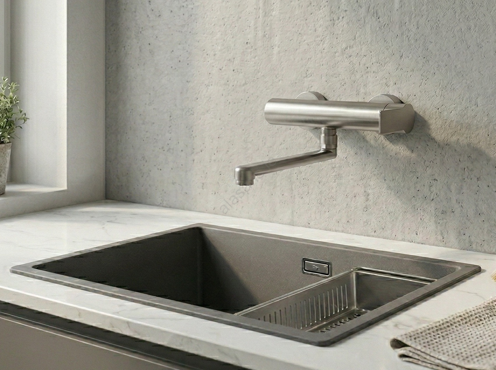 • Wall-mounted kitchen faucet with a stainless-steel finish.