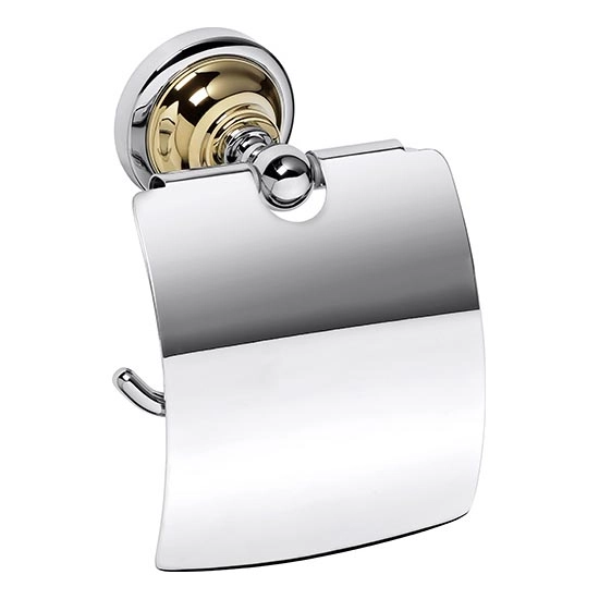 • Elegant toilet paper holder with cover in a gold and chrome finish.