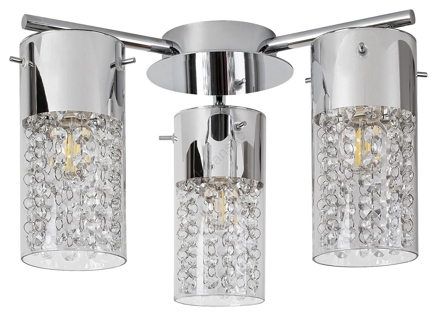 The Niagara bathroom ceiling light with 3 bulbs, representing a classic style, will be a dominant addition to your bathroom decor. This elegant model provides atmospheric lighting for your evening ritual before sleep. The ceiling light, consisting of a chrome-colored metal fixture and transparent shades, can be used with 3 bulbs, each with a power of up to 40W. The socket type is E14. The 3 light heads hang from chrome-colored support rods that extend from a round decorative base. The Niagara light is accentuated with decorative crystal elements beneath the glass shades, reminiscent of a waterfall – as suggested by the name of the fixture. The IP44 rating of this light ensures its protection against the ingress of objects with a diameter of 1 mm and against splashing water from any direction. The dimensions of this bathroom ceiling light are as follows: width 335 mm, distance from the ceiling 215 mm, installation diameter 100 mm. This model is supplied without light sources.