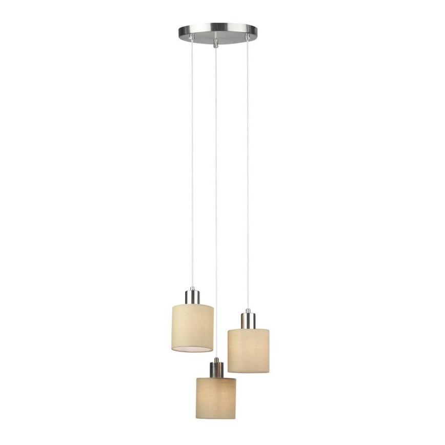 The Natina triple pendant light features a modern, understated design and colors. The metal body of the light made in a brown-satin chrome color combination is complemented by cylindrical fabric lampshades and a metal decorative base. The width of the triple pendant light is 330 mm, the diameter of the round decorative base is 220 mm and its distance from the wall is 1170 mm. With three lampshades hanging at different heights, this pendant light will be a truly spectacular solution for lighting your modern living room or dining room. The Natina interior light can be used with three energy-saving bulbs with a wattage of up to 25 W each. If you want to enhance the cozy, intimate atmosphere, use bulbs emitting a warm white light. The thread type is E14. The Natina triple pendant light is supplied without bulbs.