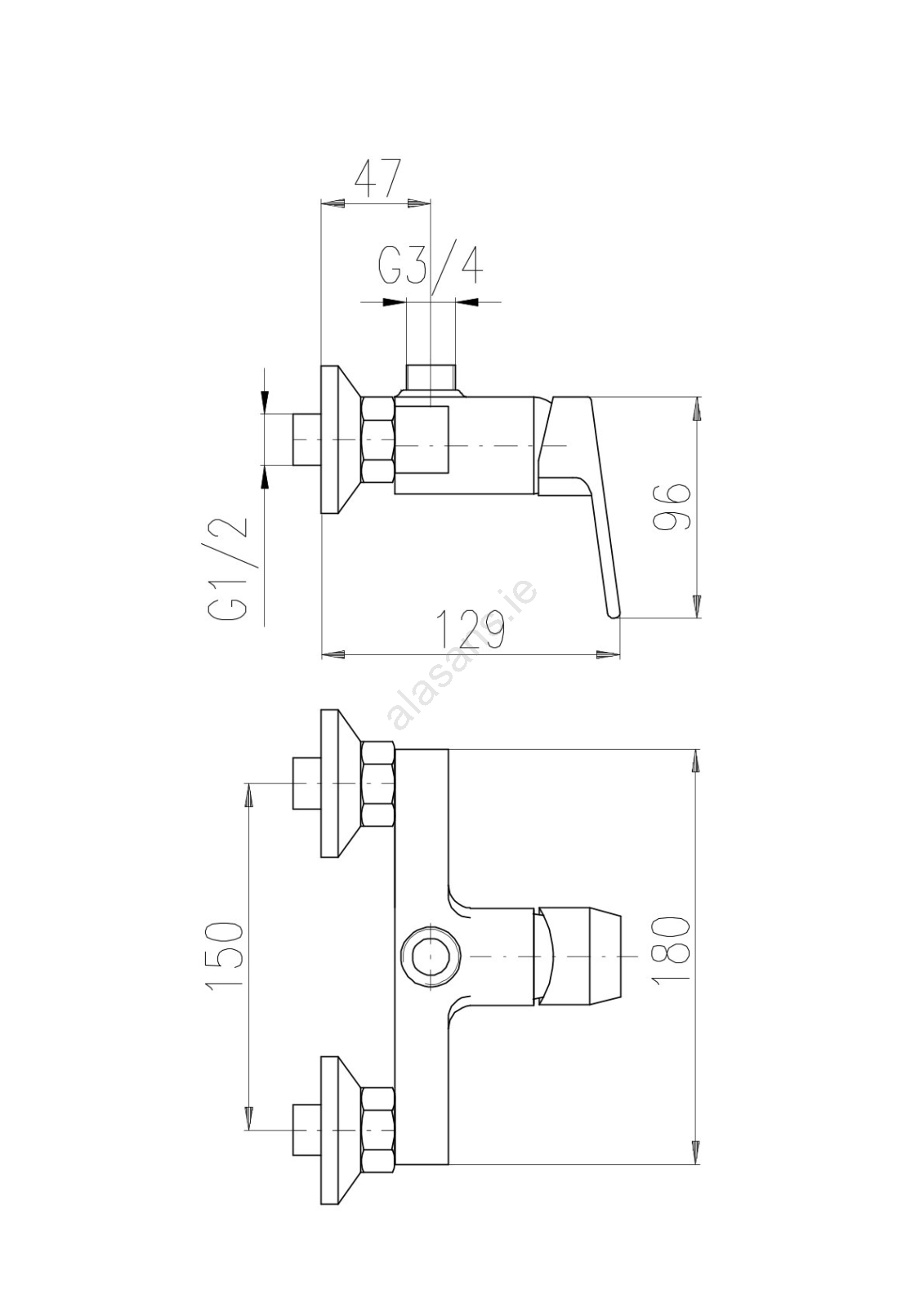 • Wall-mounted shower mixer with top 3/4" outlet for a shower rail.