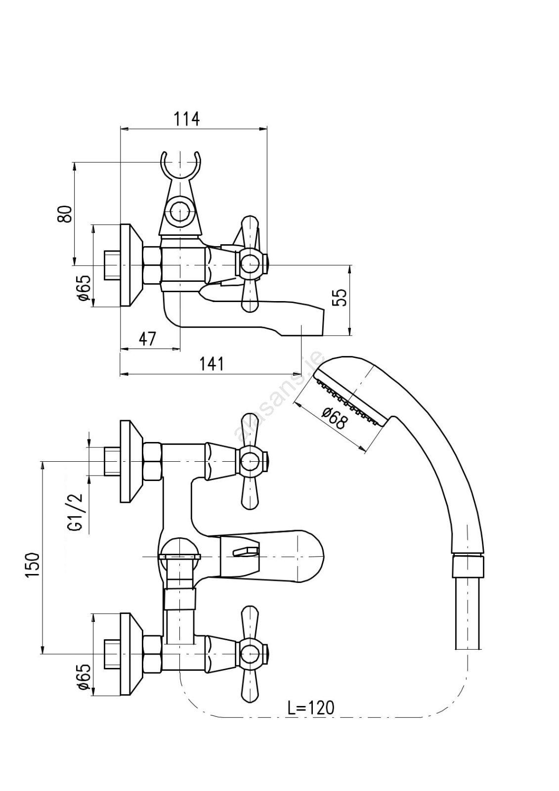 • Bath set with a wall-mounted bath mixer featuring a ceramic diverter, a shower holder and a hand shower.