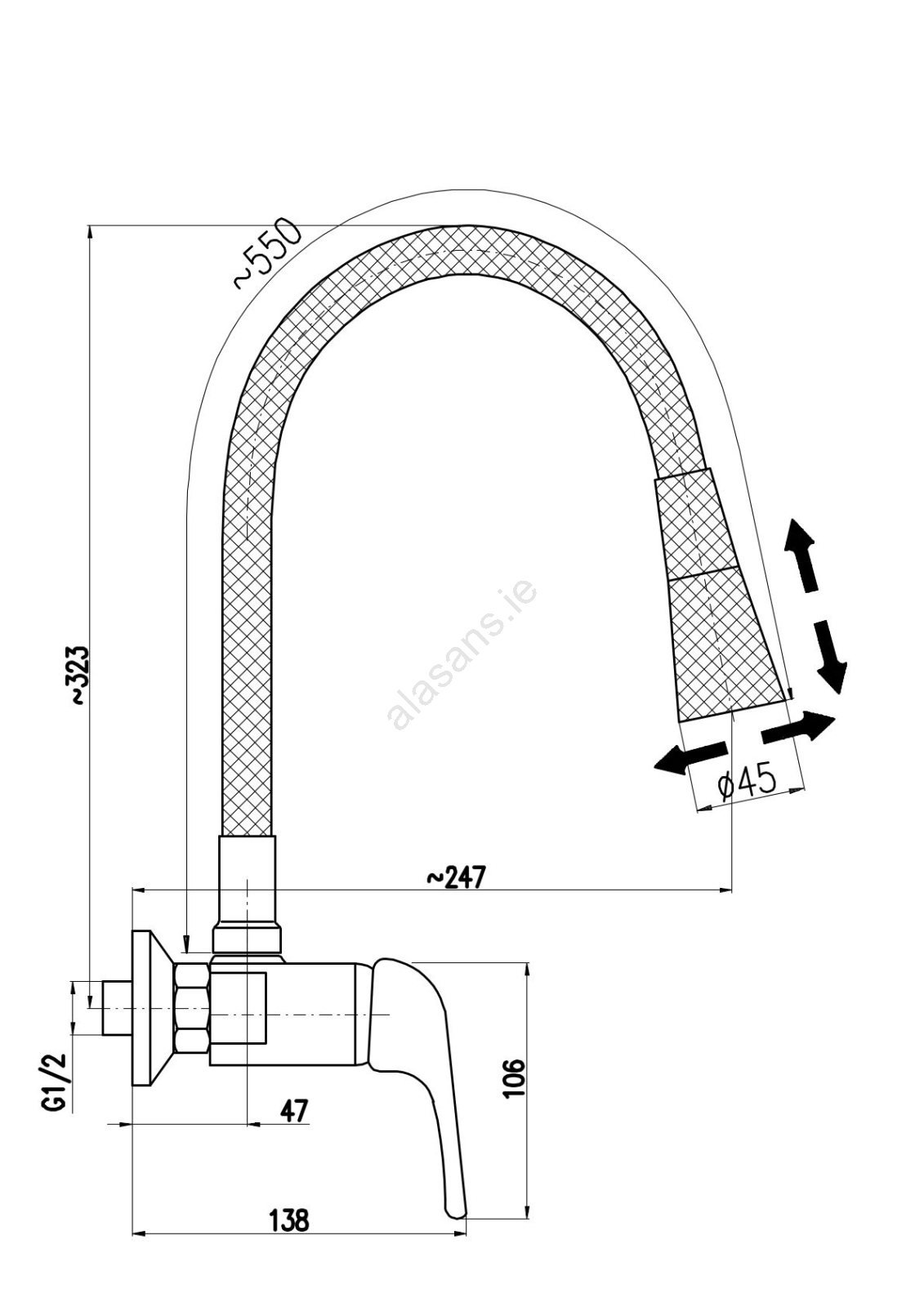 • Wall-mounted sink faucet with flexible swivel spout and spray head.