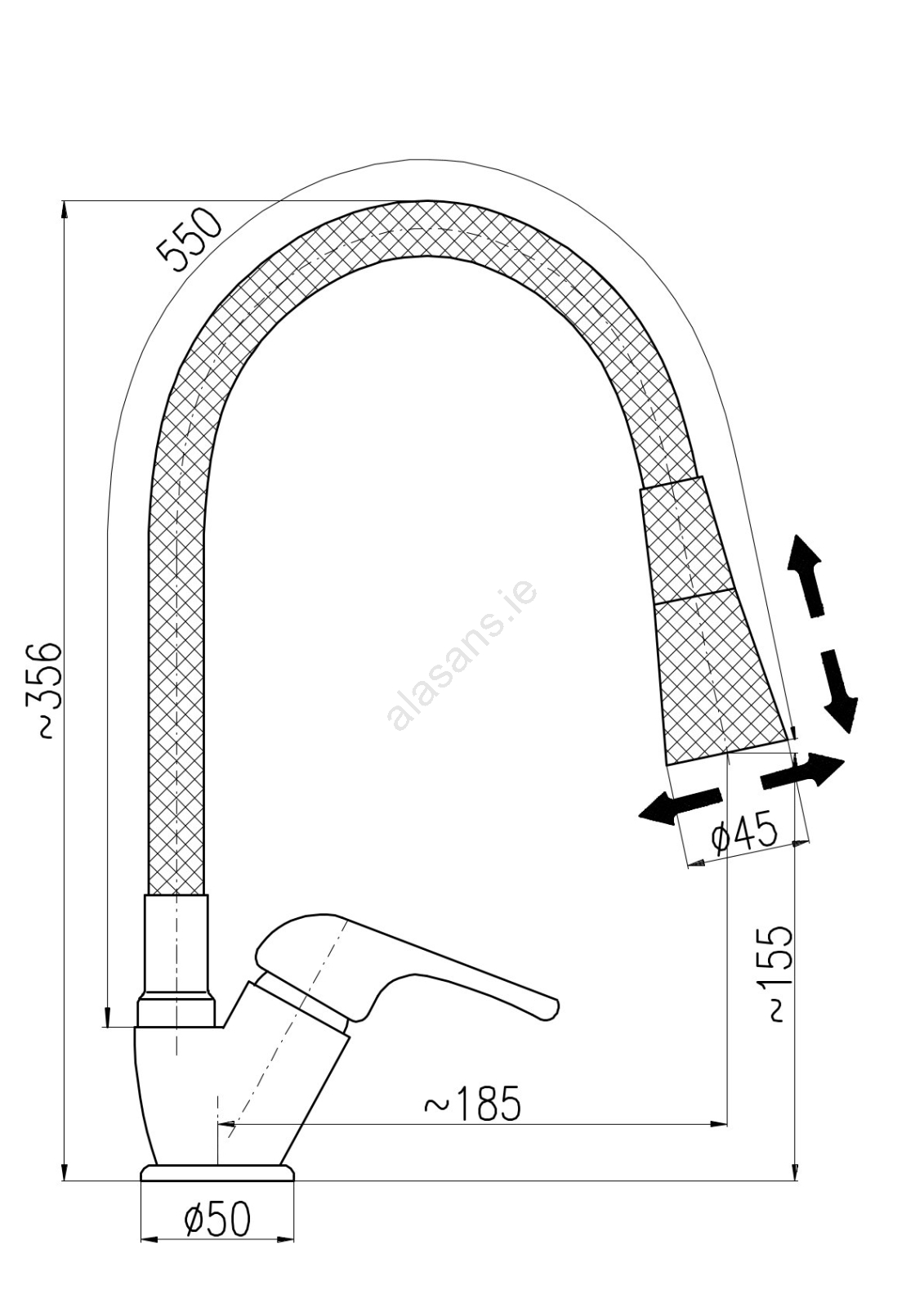 • Deck-mounted sink faucet with a flexible swiveling spout and spray head.