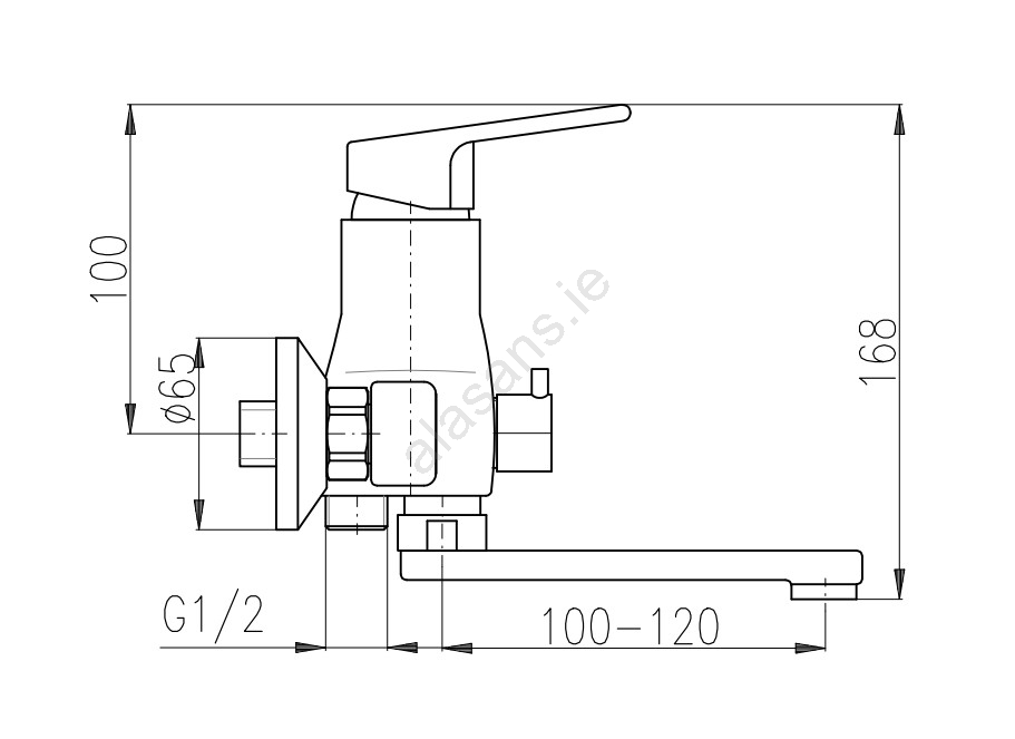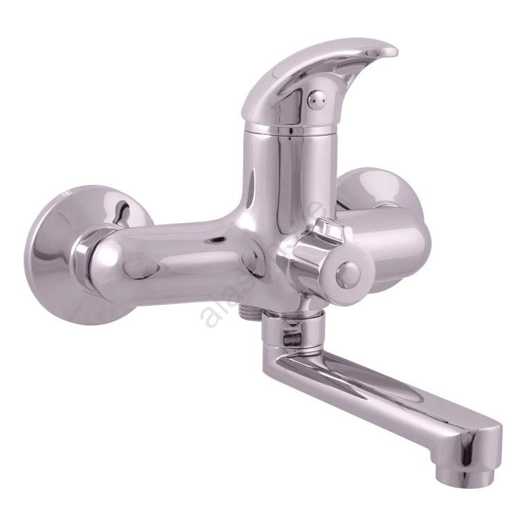 • Wall-mounted bathtub faucet with a flat swivel spout.