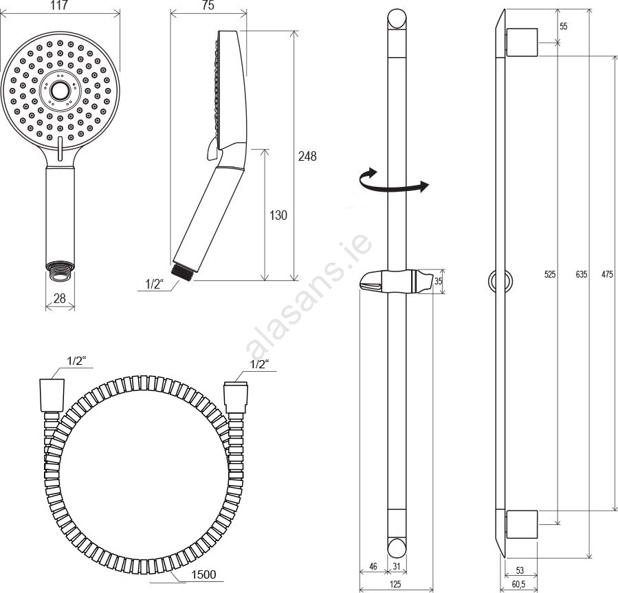 • Swiveling shower rail with a 63.5 cm sliding shower holder.