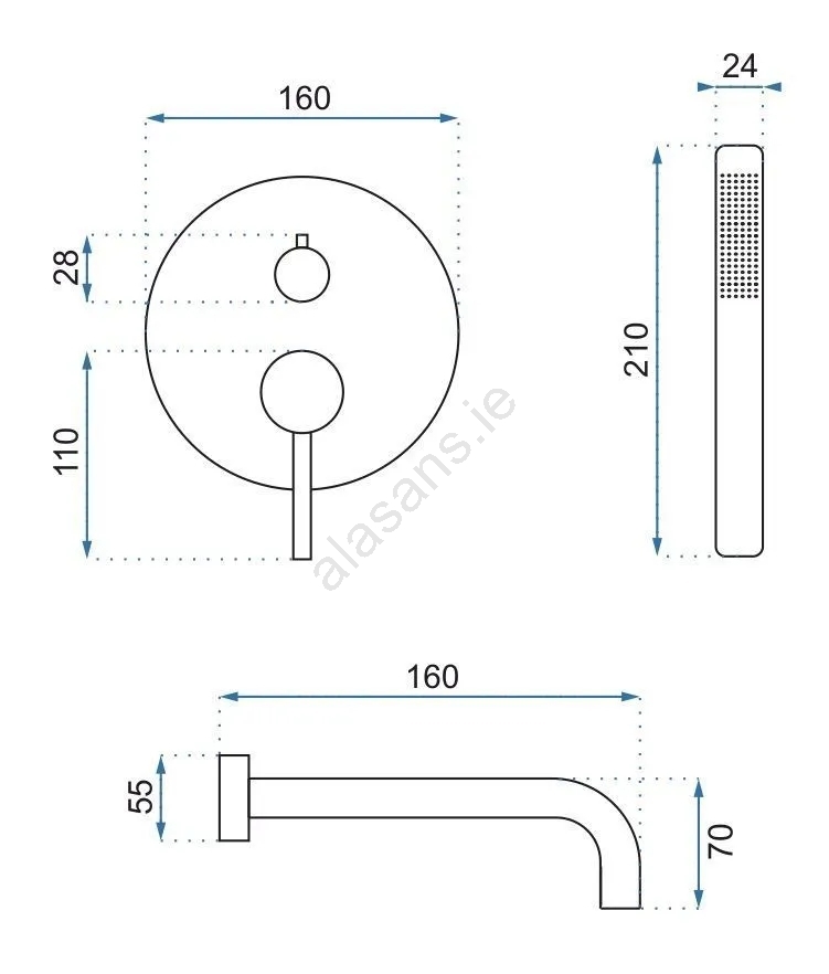 • Set includes: bath mixer, wall-mounted spout, hand shower, shower hose (160 mm), hand shower holder.