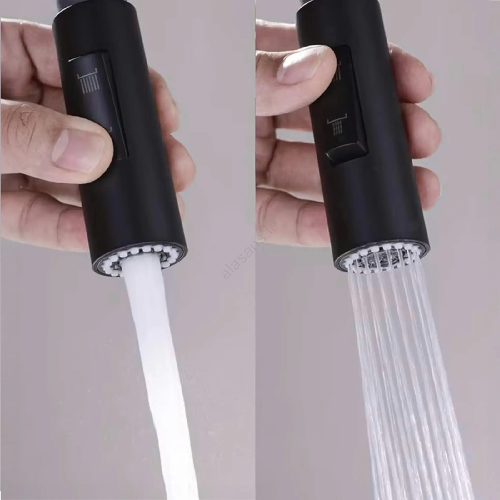 • The nozzle tip features a switch allowing you to choose between a wide aerated stream and a concentrated spray.