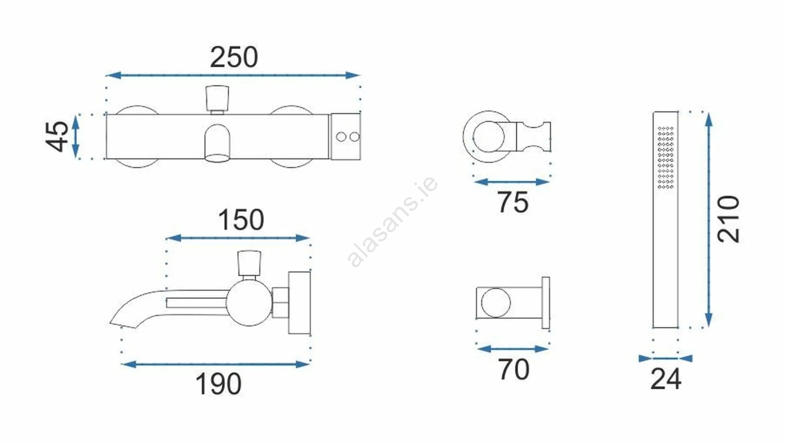 • Set includes: bath faucet, handheld shower, shower hose (190 mm), handheld shower holder.