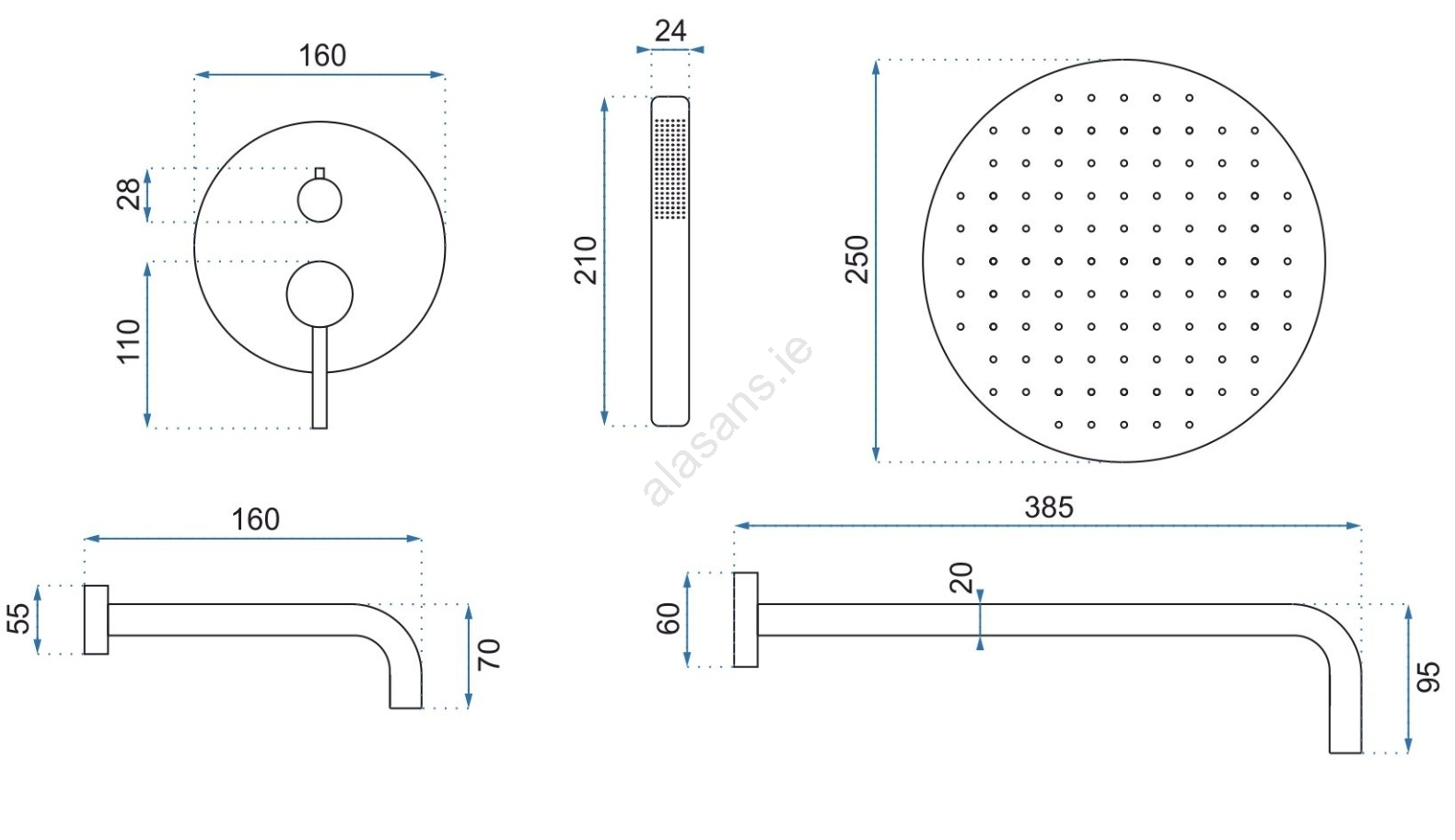 • Package includes: concealed box, complete mixer, shower arm, handheld and overhead shower, hand shower holder, spout, 150cm hose.