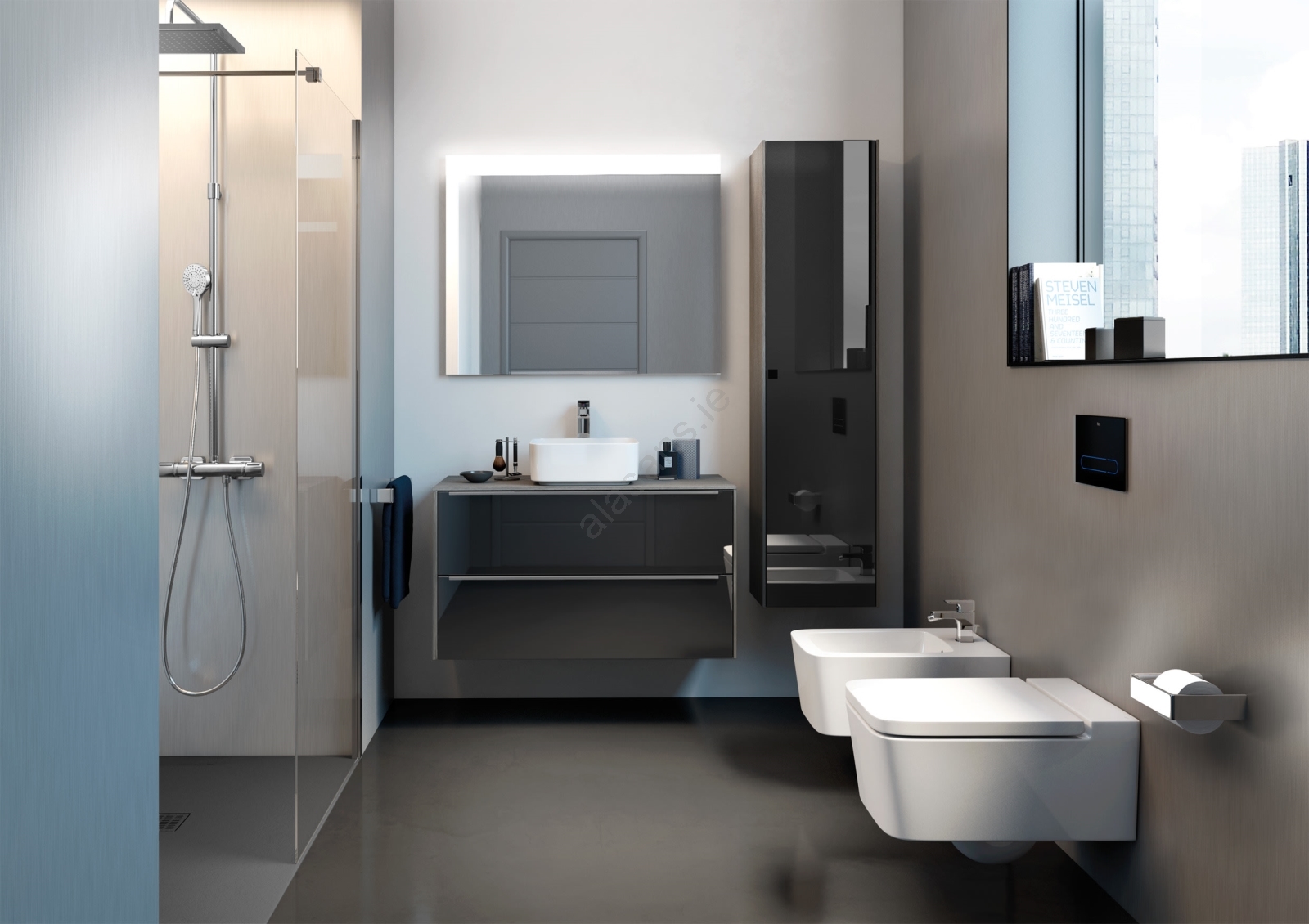 • Wall-hung rimless toilet.