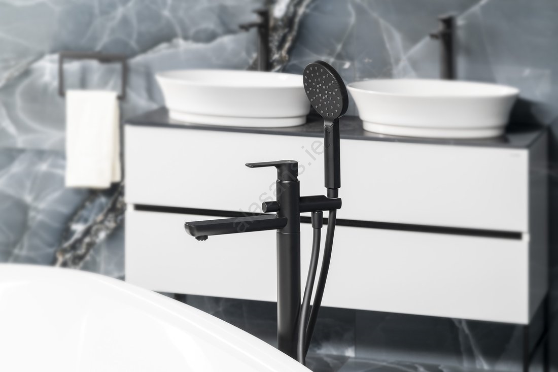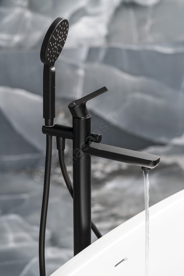 • This floor-mounted freestanding bathtub faucet connects to the floor.