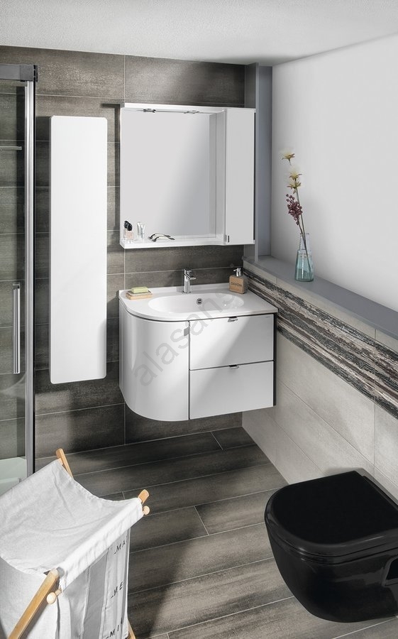 • Asymmetrical design with a sleek white finish.