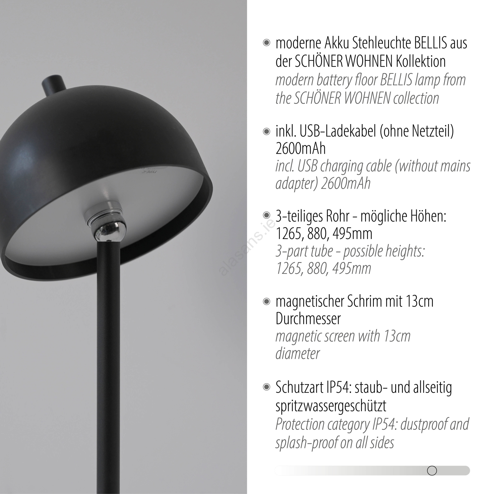 • Schöner Wohnen 19245-18 - BELLIS LED Touch-Dimmable Rechargeable Outdoor Floor Lamp, 2.5 W / 5 V, 2600 mAh, IP54, Black