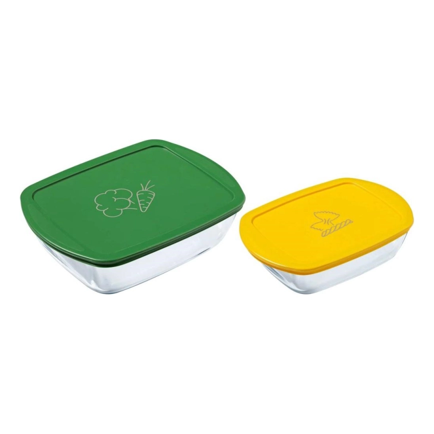 • 2x Pyrex containers made of durable borosilicate glass are designed for food preparation, reheating, storage and freezing.