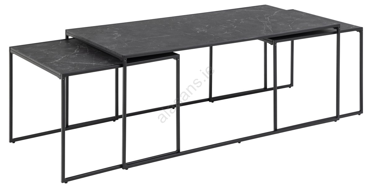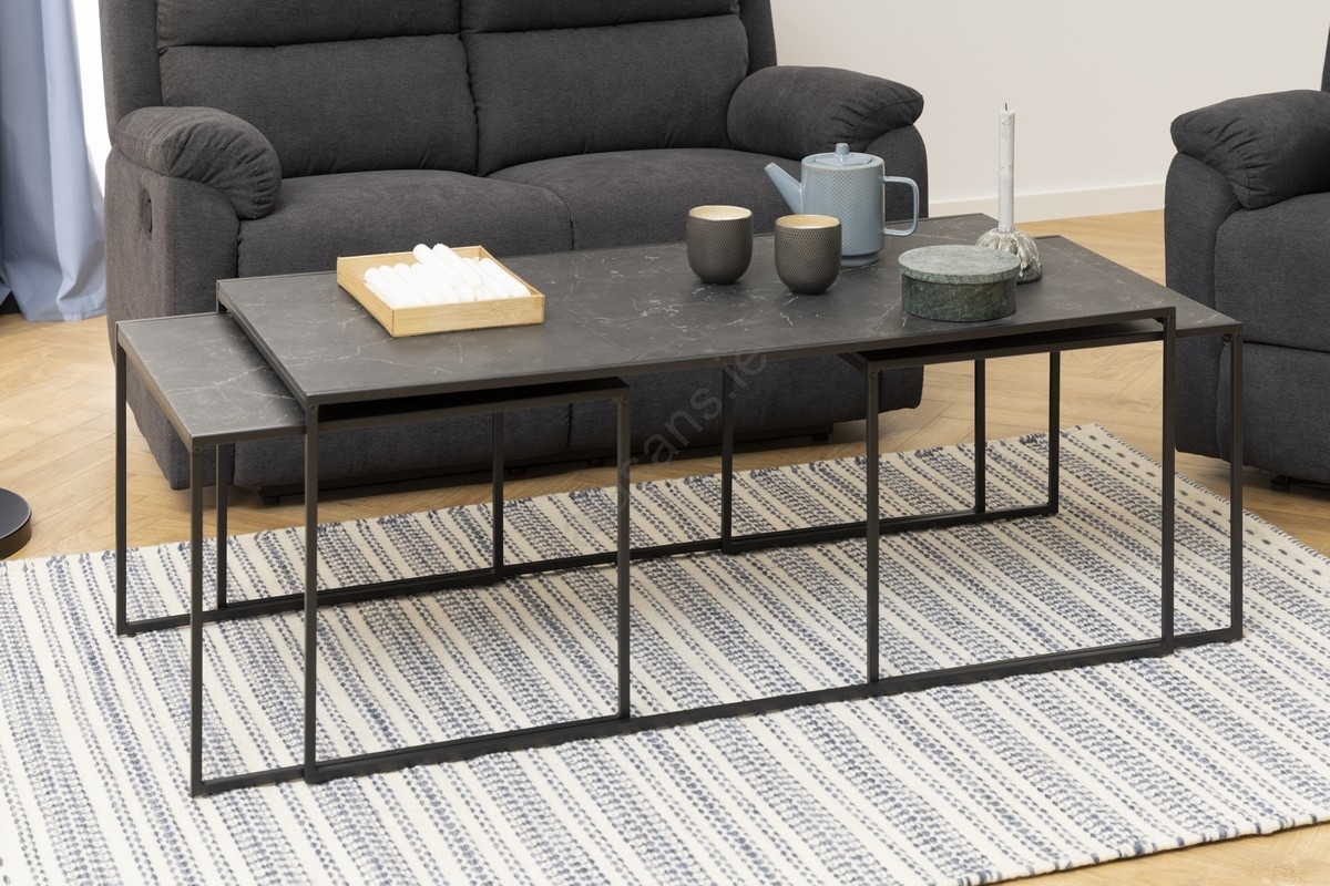 • With clean lines, marble appearance, and black powder coating, this coffee table set fits almost any living room.
