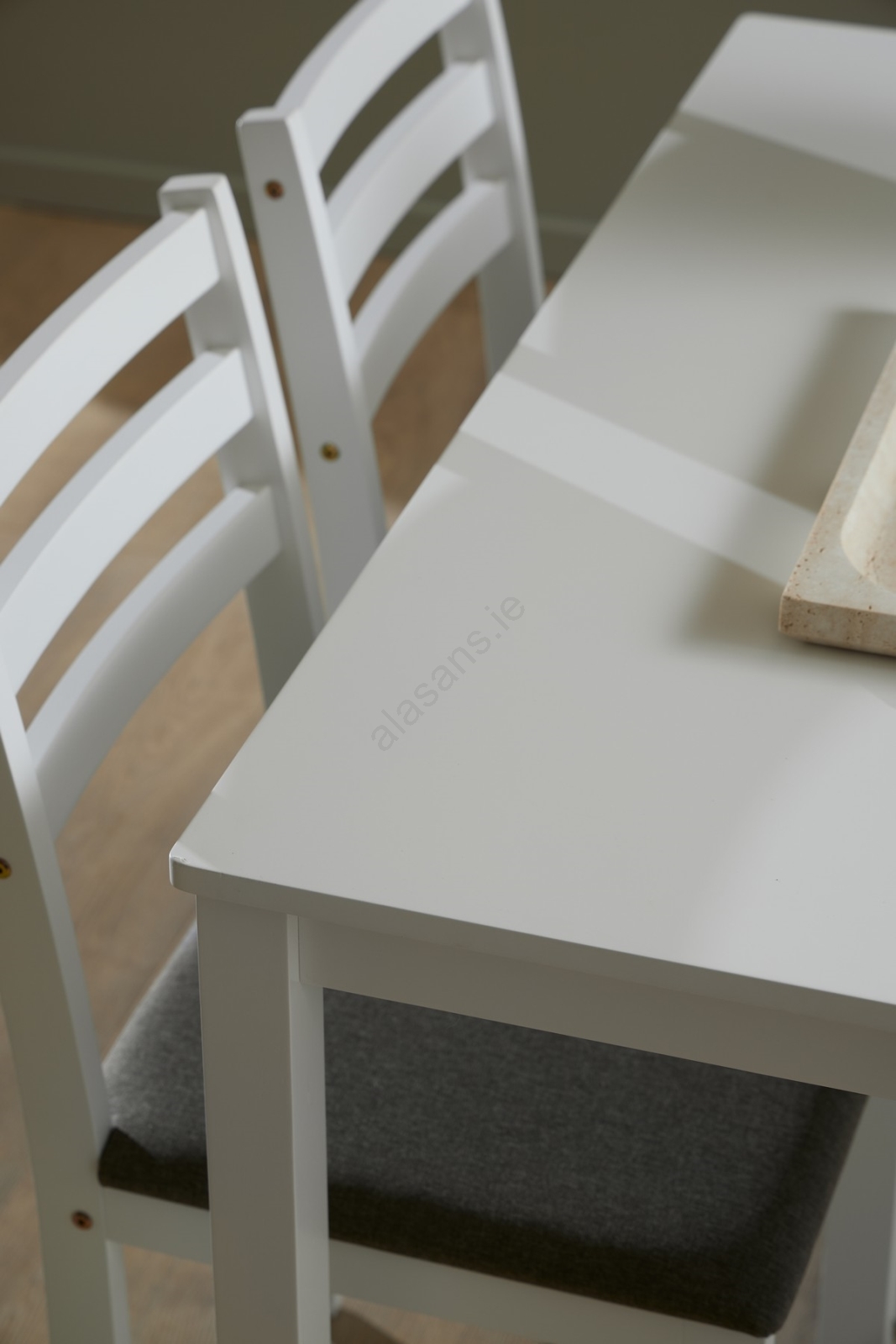 • It consists of a rectangular dining table and 4 matching chairs with padded light-grey seats, all crafted from solid wood in a white finish.