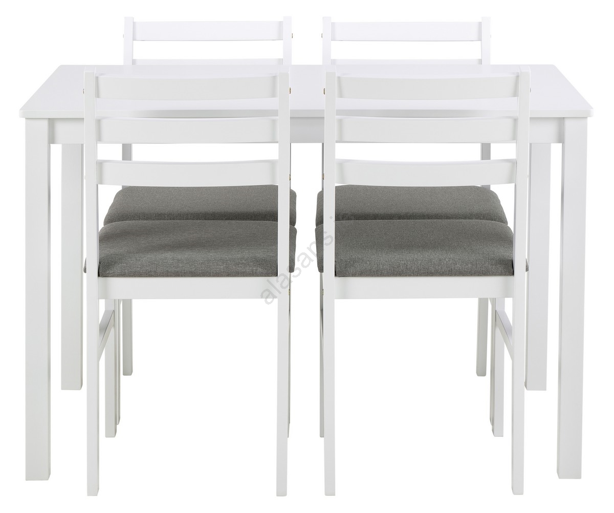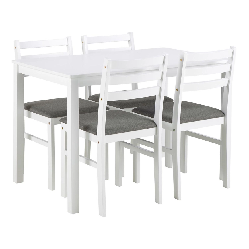 • It consists of a rectangular dining table and 4 matching chairs with padded light gray seats, all made from solid wood in a white finish.